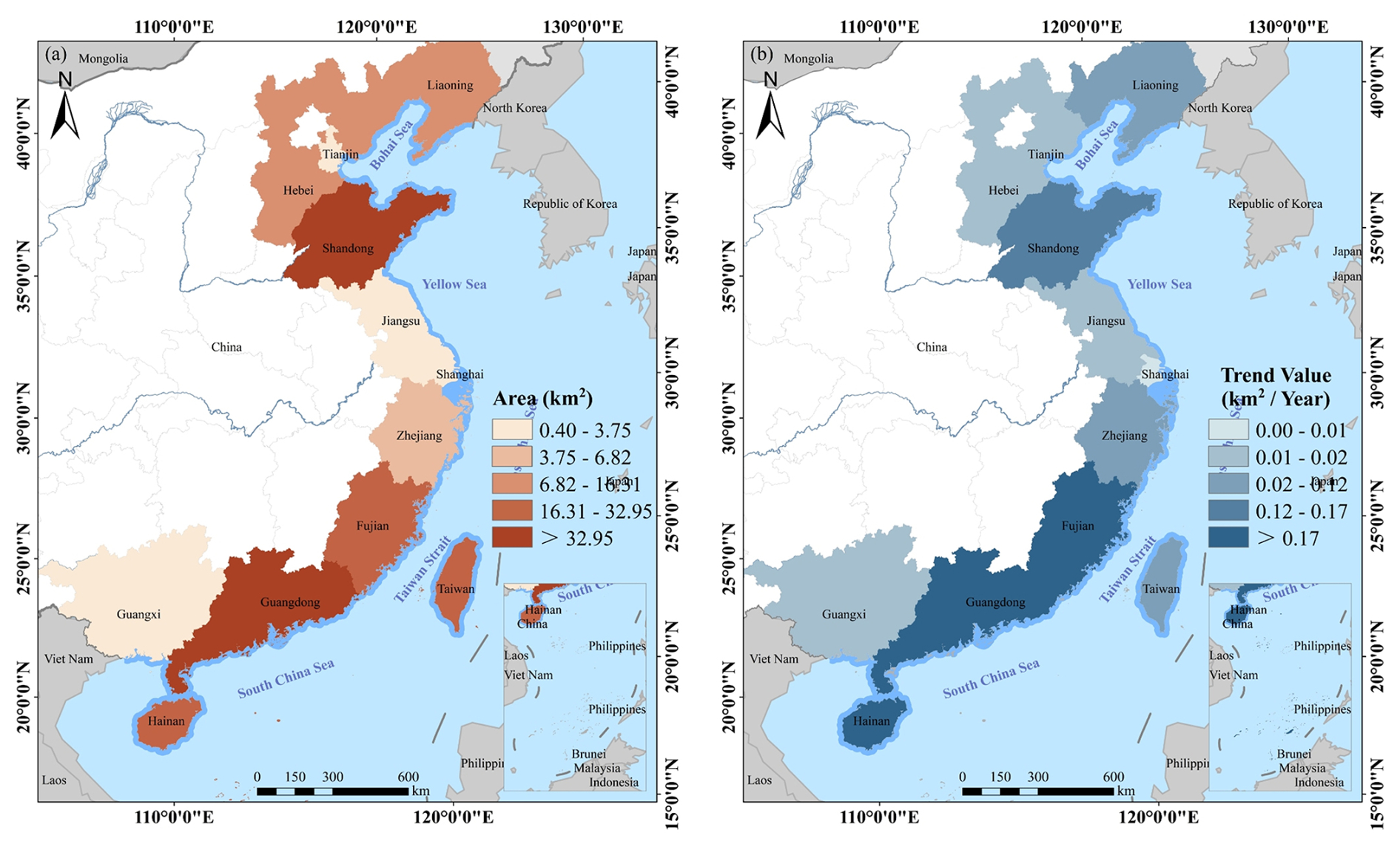 Figure 10Interannual changes in human infrastructure squeeze on sandy beaches: (a) Risk area of human infrastructure squeeze from 1990 to 2024, (b) Changes in risk area of human infrastructure squeeze from 1990 to 2024.