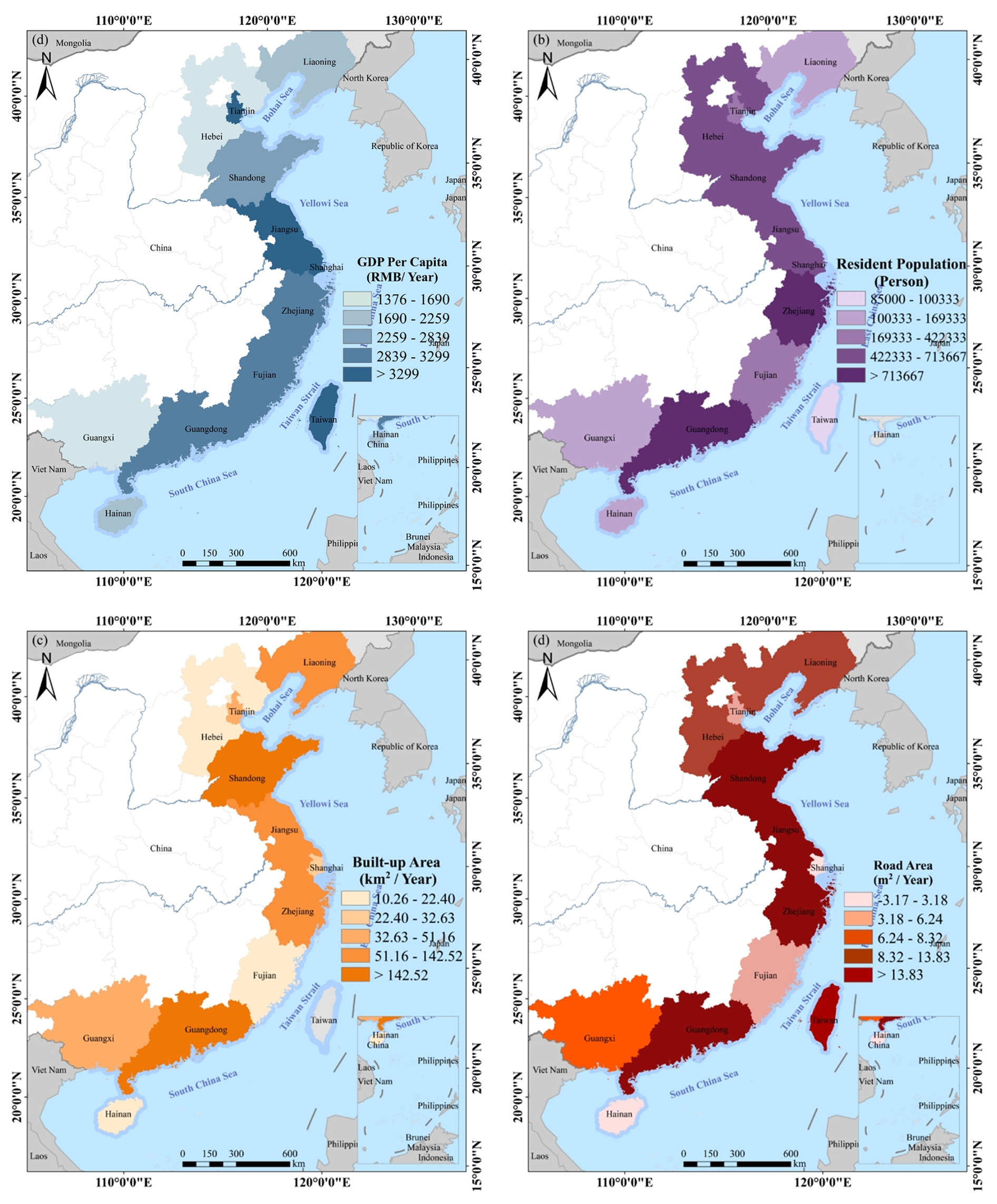 Figure 14Spatial changes of various factors from 1990 to 2024: (a) per capita GDP change, (b) resident population change, (c) built-up area change, (d) road area change.