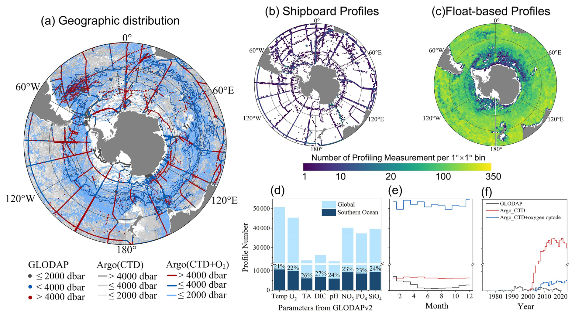 There are substantial spatial sampling gaps in the high-quality GLODAP data, particularly in the high-latitude Southern Ocean (Fig. 1). Furthermore, Fig. 1 reveals a pronounced seasonal bias toward the austral summer, with nearly four times as many measurements collected during this period compared to winter. In contrast, Argo floats provide extensive spatiotemporal coverage, owing to their flexible deployment and consistent 10 d sampling cycles. Although the number of Argo floats equipped with oxygen sensors have increased greatly in recent decades (Fig. 1f), the Argo observational network is still predominantly composed of Core-Argo floats without oxygen sensors, which constitute over 85 % of the dataset and achieve nearly complete spatial coverage across the Southern Ocean (Fig. 1a and c). The broad coverage offers an unprecedented foundation for reconstructing carbon system dynamics in the region. However, because of current limitations in data quality and correction methods (Maurer et al., 2021; Williams et al., 2017), nitrate and pH measurements from BGC-Argo floats are not used in this study; only temperature, salinity, and O2 are employed. Ongoing improvements in quality control and correction procedures may enable the incorporation of these measurements in future studies.