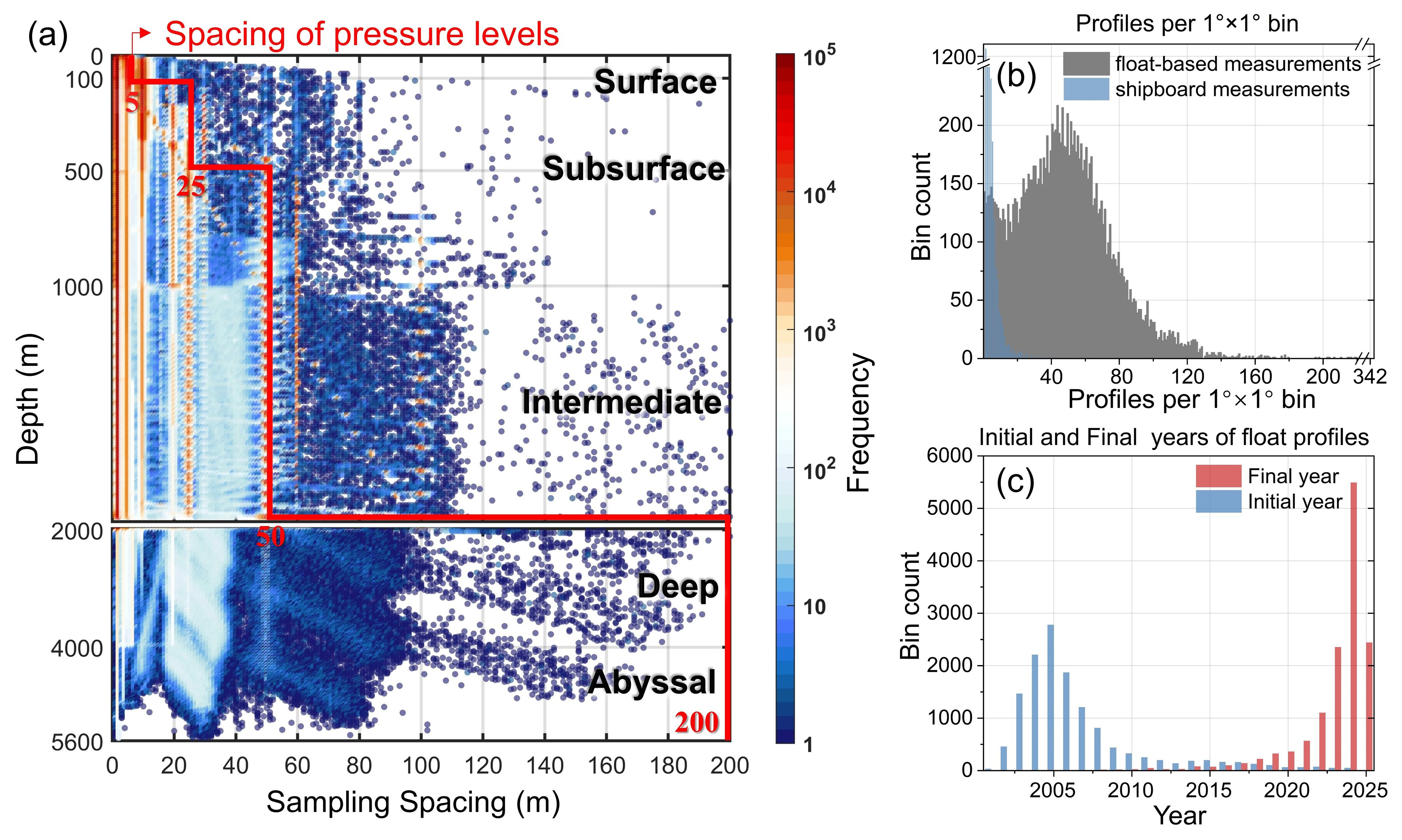 Figure 3(a) Sampling spacing of all Argo floats from sea level to 5600 m. The color of the scattered points shows the frequency. The yellow line illustrates the pressure level used in this study to match sampling spacing and maximum utilize available profile data. (b) Histogram of number of profiles per 1°×1° bin. (c) Histogram of initial year (in blue) and final year (in red) per 1°×1° bin.