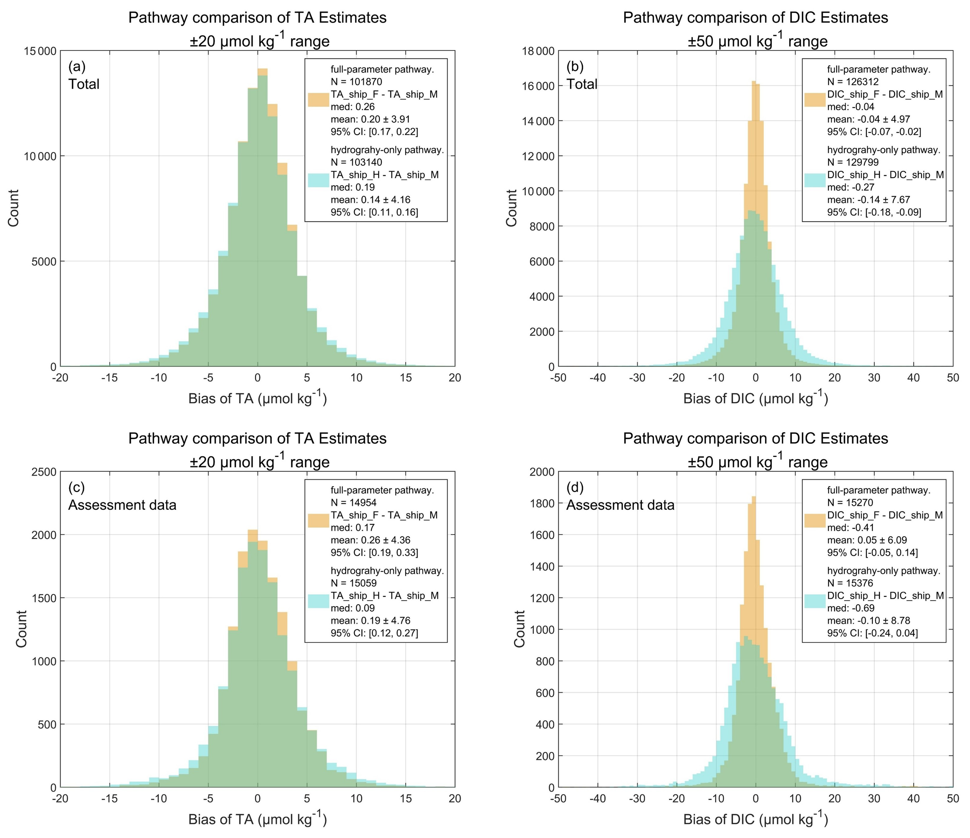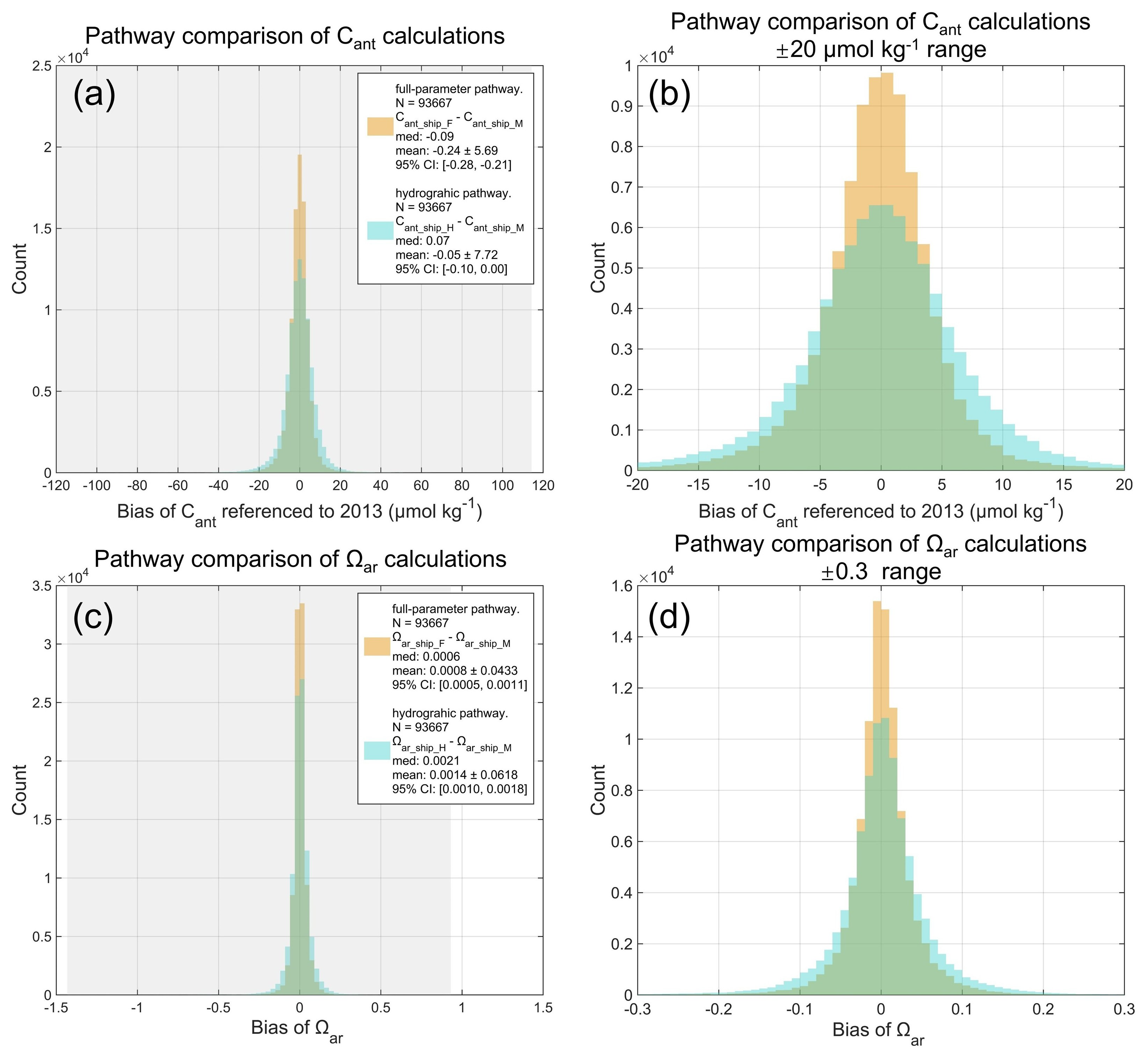 Figure 5Histograms of calculation biases between the full-parameter pathway (orange; includes oxygen concentration) and the hydrography-only pathway (cyan, excludes oxygen concentration) for (a, b) anthropogenic carbon (Cant) and (c, d) aragonite saturation state (Ωar). Bias is defined as the difference between values calculated using ESPER_NN-derived variables or GLODAP shipboard measurements. The grey background denotes the full range of bias values, with all x axis centered at zero (bias=0) for visibility. (b) and (d) were the same as (a) and (b), but with a restricted x axis range of ±20µmol kg−1 for Cant and ±0.3 for Ωar. Figure legends indicate the calculation pathway, number of data, median values, mean values ±1 SD, and 95 % confidence intervals.