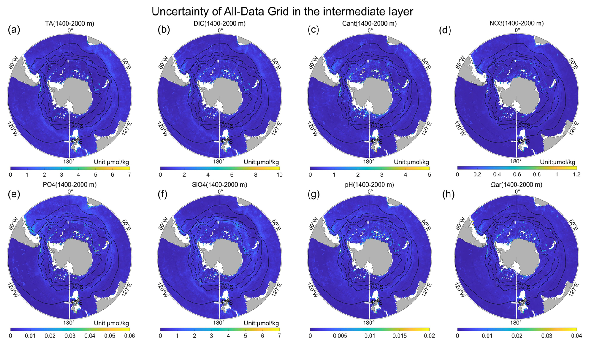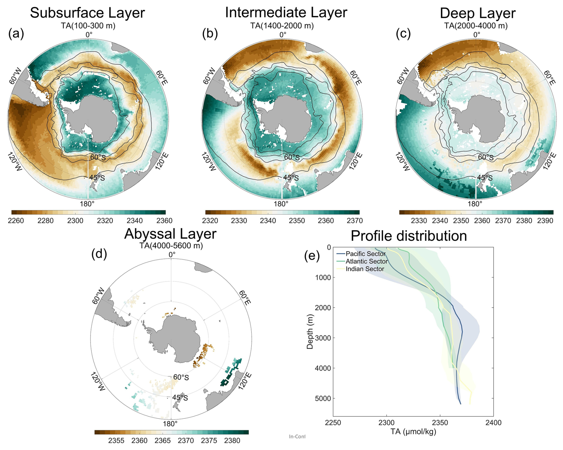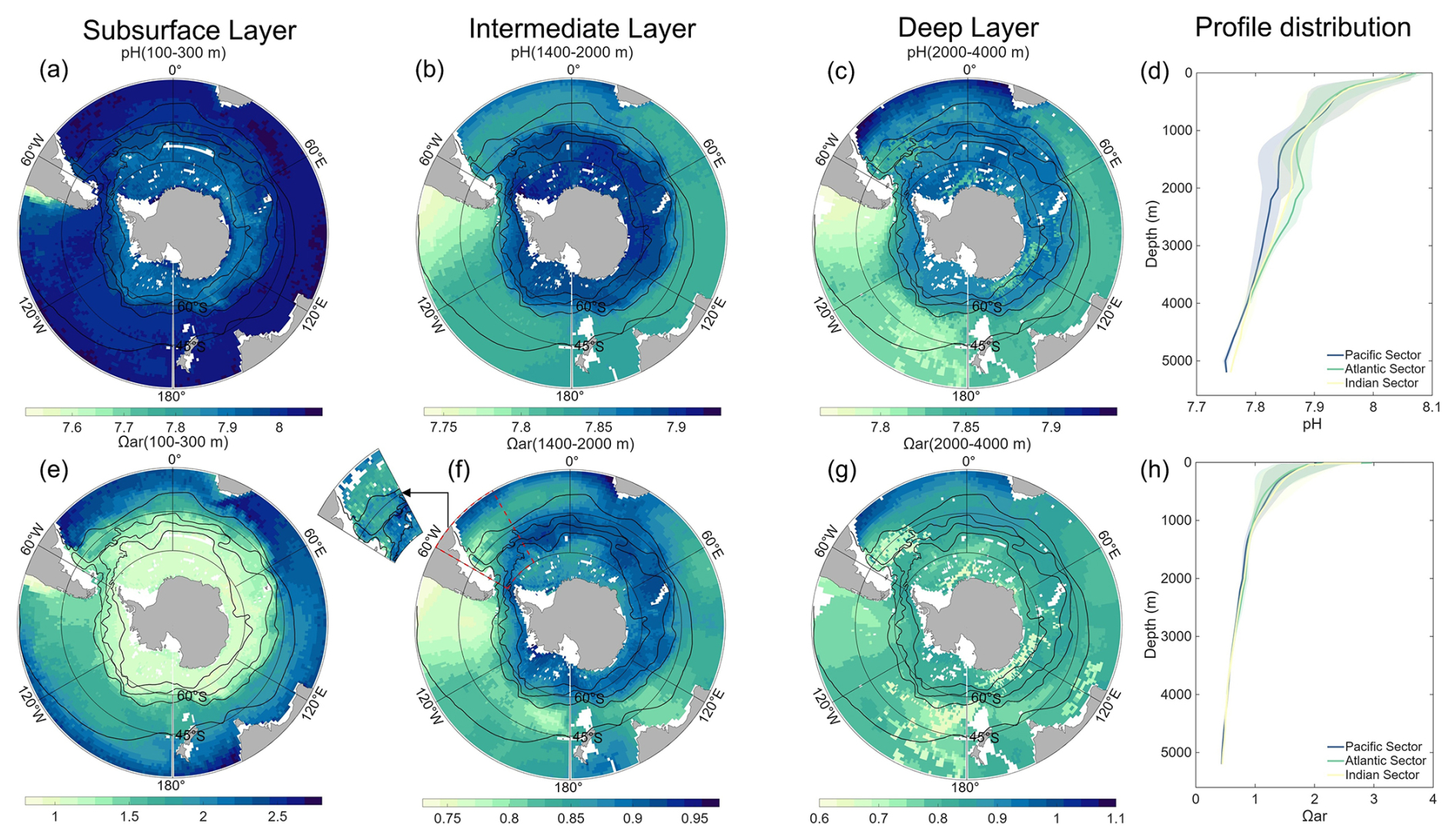 The accumulated Cant uptake and increased DIC concentrations intensify OA, leading to declines in both pH and Ωar. Spatial distributions of pH and Ωar (Fig. 8) closely resemble those of DIC (Fig. 7a–d). In the subsurface layer, pH exhibits a spatial distribution pattern nearly identical to DIC. However, Fig. 8e demonstrates distinctly lower Ωar value south of the STF. Both pH and Ωar values decrease markedly from the surface to approximately 1000 m, with more gradual declines at depths below 1000 m. In the intermediate and deep layer, the Pacific Sector shows the lowest pH and Ωar values, followed by the Indian Sector and Atlantic Sector, respectively.
