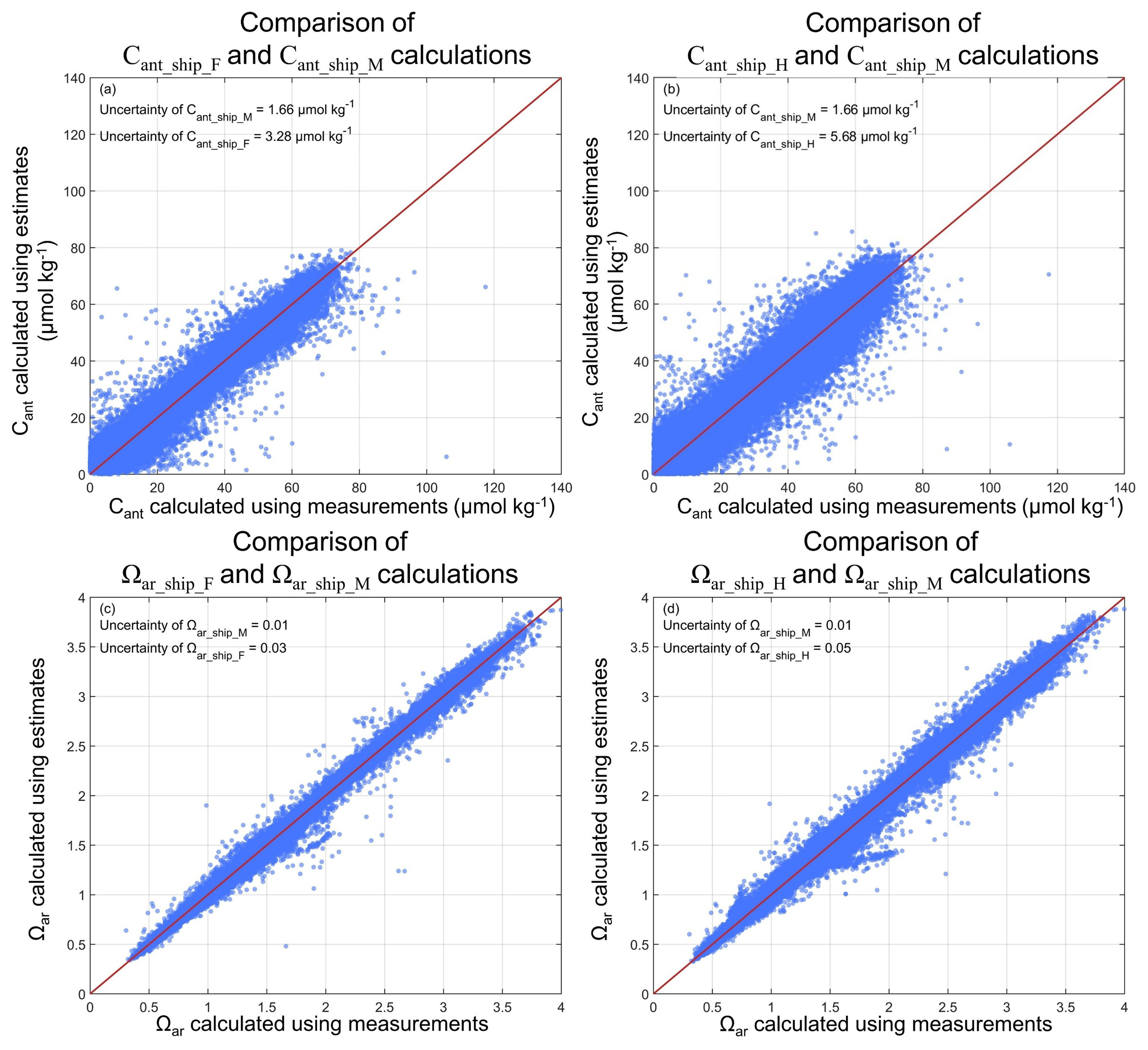 We first analyze the methodological discrepancies between the two reconstruction pathways using high-quality shipboard measurements. Biases in Cant and Ωar are quantified by using ship-based observations with concurrent O2, TA, and DIC measurements (N=93 667). Parameter values derived directly from measured shipboard data are compared with those calculated from reconstructed DIC, TA for two pathways (Fig. 5).