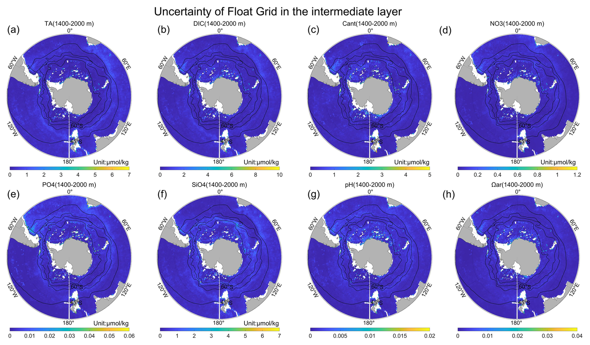 Overall, the ESPER_NN demonstrates the highest accuracy and lowest uncertainty under both reconstruction pathways (Table 2), supporting its selection as the primary model for reconstructing carbonate system parameters and nutrients in the Southern Ocean throughout this work. Based on the estimated RMSE of ESPER_NN, float-derived estimates are expected to fall within twice the model's estimated uncertainty range, serving as a criterion for the quality control applied to the Argo float dataset.