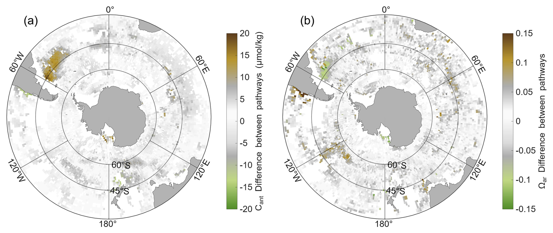 Figure B2Differences between reconstruction pathways for (a) Cant (µmol kg−1) and (b) Ωar from BGC-Argo floats with O2 sensors. For each 1°×1° bin, the mean vertical difference between the hydrography-only and full-parameter pathways are calculated. Values falling within the range derived from float–shipboard matchups are shown in grey, whereas brown and green indicate positive and negative differences, respectively.