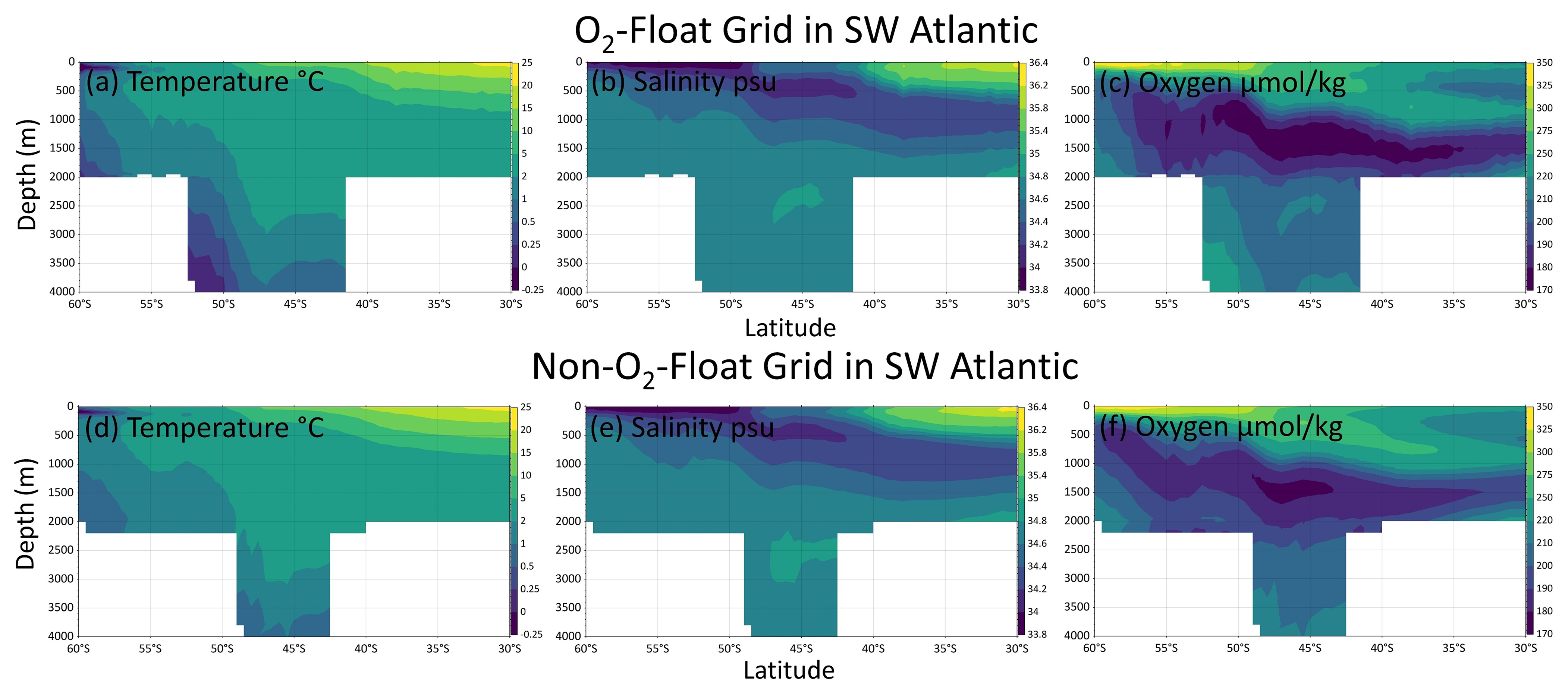 Figure B3Zonal-mean sections (averaged between 60 and 30° W) of temperature, salinity, and oxygen from 60 to 30° S in the southwestern Atlantic Ocean. Panels (a–c) show profiles from the O2-Float Grid, and panels (d–f) from the Non-O2-Float Grid. Note that oxygen is measured in panel (c) and reconstructed in panel (f).