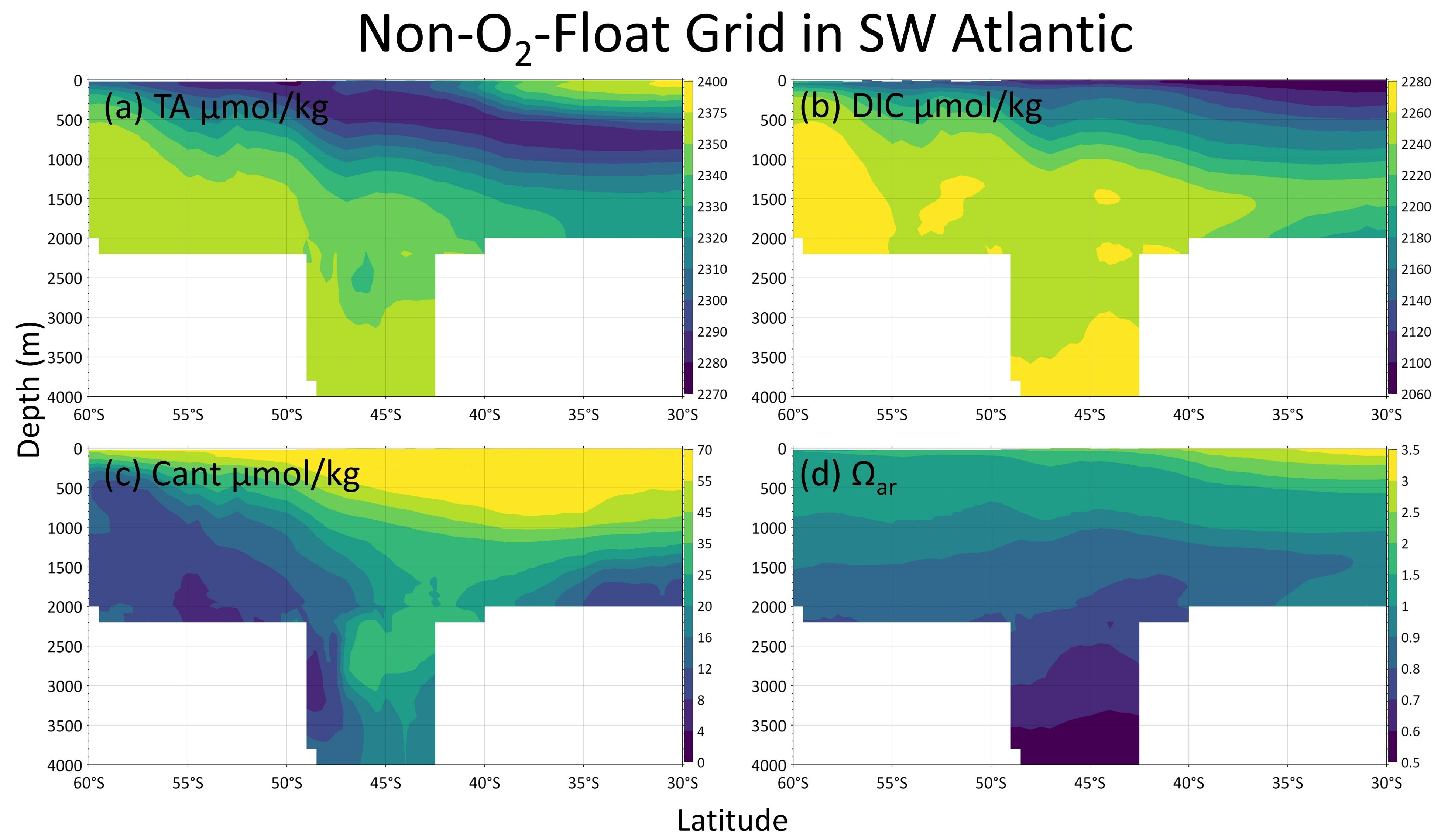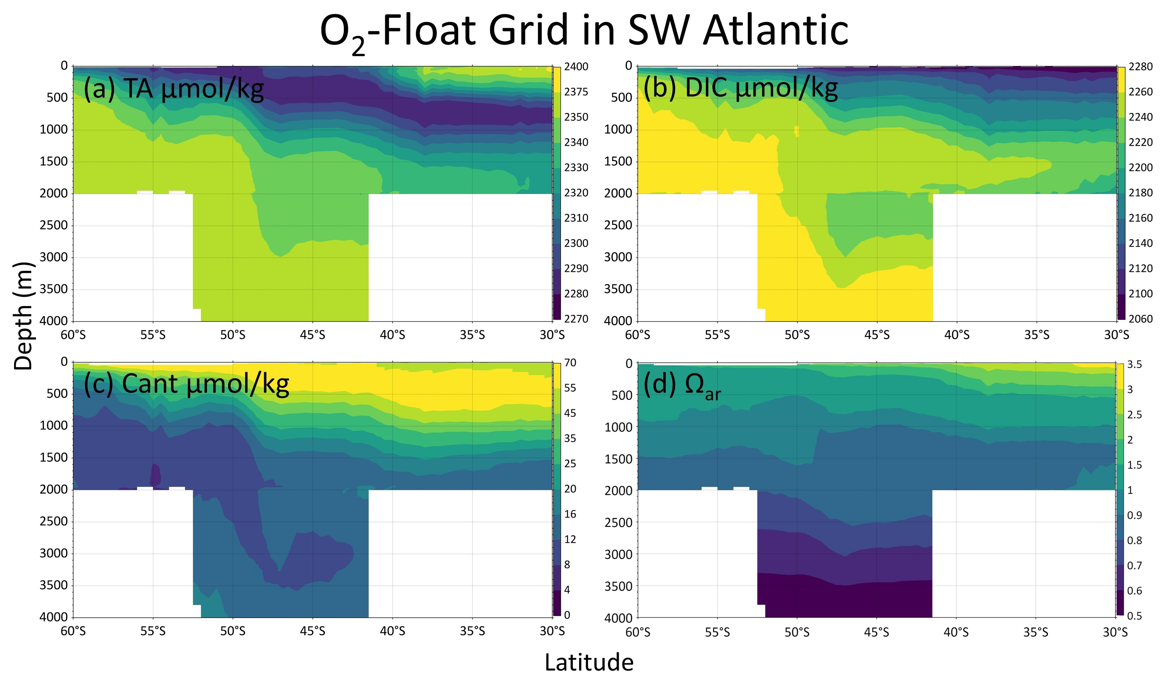 Figure B4Zonal-mean sections (averaged between 60 and 30° W) of TA (a), DIC (b), Cant (c), and Ωar (d) from 60 to 30° S in the southwestern Atlantic Ocean. The profiles are from the O2-Float Grid.