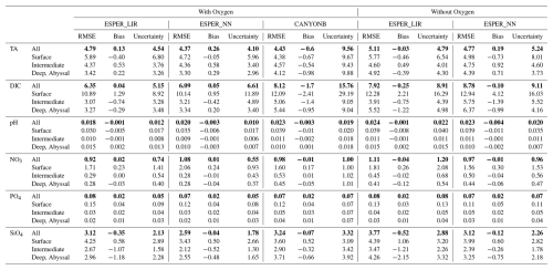 Table 2The statistics (r2, RMSE, and mean bias) were compared between estimated parameter values from ESPER_NN and CANYON-B using assessment data added after the original GLODAPv2.2020 release (i.e., all cruises with GLODAPv2 cruise numbers 2107, Table 1). In addition, the reconstructed performance of model was examined for the entire water column as well as for specific depth ranges: surface (0–200 dbar), intermediate (1000–2000 dbar), and deep and abyssal (>2000 dbar).