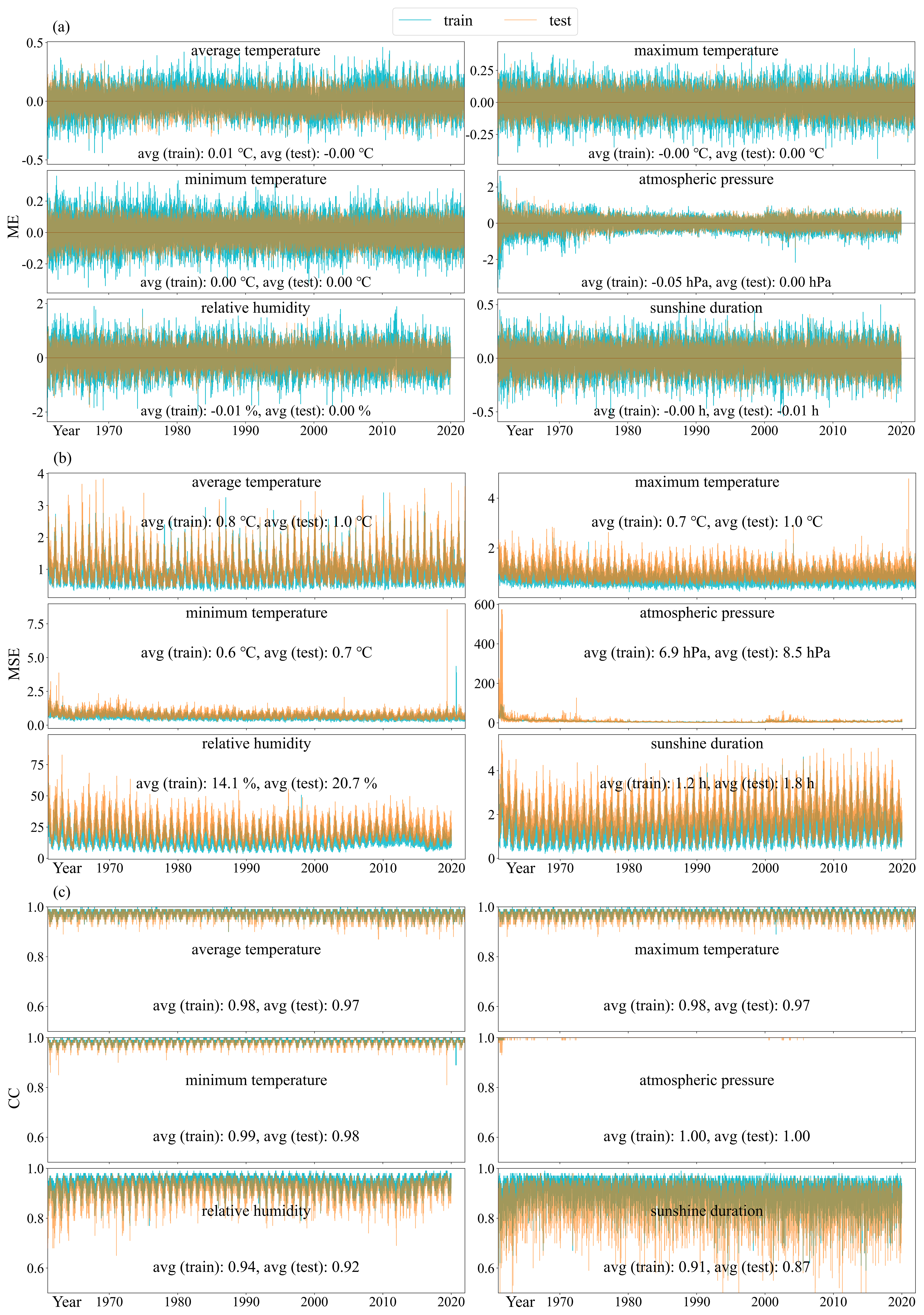 To evaluate the generalization capability of the reconstruction models and prevent overfitting, we randomly assigned 10 % of the daily in-situ observations from 1961 to 2021 to the test dataset using a fixed random seed, with the remaining 90 % used for training. Figure 4 presents the performance metrics of the daily MLP models across six meteorological variables: average temperature, maximum temperature, minimum temperature, atmospheric pressure, relative humidity, and sunshine duration. Three standard evaluation metrics are used: ME (Fig. 4a), MSE (Fig. 4b), and CC (Fig. 4c). The mean values of all metrics are highly consistent between training and test phases, indicating strong generalization and no evidence of overfitting. These results confirm the stability and precision of the deep learning-based hierarchical progressive reconstruction framework. Notable deviations across all metrics are limited to a very small number of days and are primarily attributed to substantial gaps in the in-situ observations.