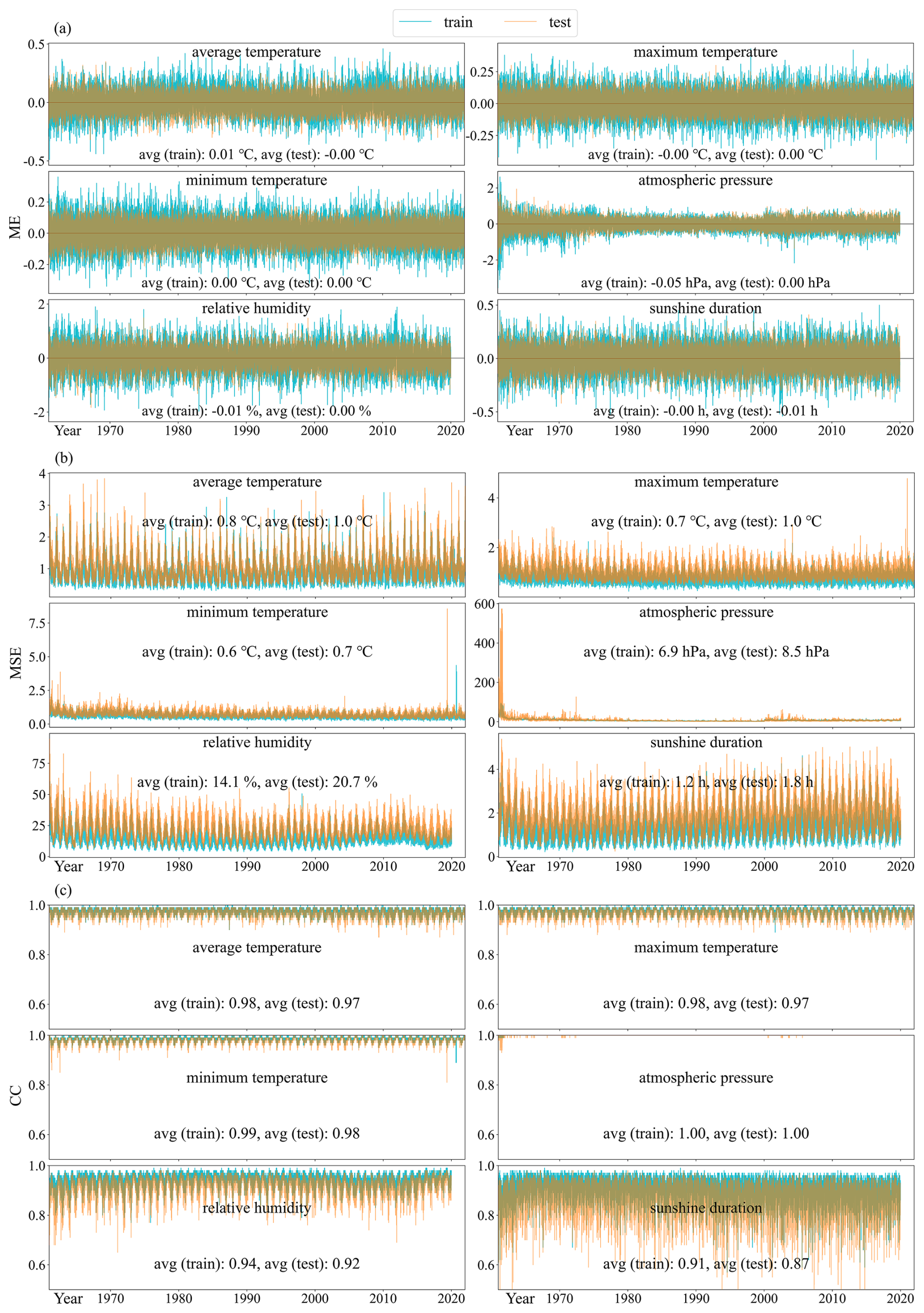 The ME values are close to zero for all variables in both phases. Specifically, the mean ME for maximum and minimum temperatures is exactly 0 °C, while the other four variables also show near-zero mean errors, with at least one phase yielding a mean ME of 0. The range of ME values is also narrow. During training, ME ranges from −0.49 °C to 0.46 °C for average temperature, −3.55 to 2.61 hPa for atmospheric pressure, −2.15 % to 1.96 % for relative humidity, and −0.54 to 0.50 h for sunshine duration. The test phase exhibits even narrower ME ranges: −0.32 to 0.36 °C (average temperature), −2.25 to 1.94 hPa (atmospheric pressure), −1.83 % to 1.49 % (relative humidity), and −0.42 to 0.41 h (sunshine duration). These results suggest minimal systematic bias in the model predictions across all variables. The MSE, which emphasizes the impact of large residuals by squaring the error magnitude, consistently exceeds the ME across all variables. As shown in Fig. 4b, the daily MSE values are low in both phases, with only a slight increase in the test phase. Temperature-related variables – including average, maximum, and minimum temperature – exhibit low and stable MSE values, with means below 1 °C2 and only minor differences (typically 0.1–0.3 °C2) between training and test phases. This indicates that the model captures temperature dynamics with high accuracy and strong generalization. For atmospheric pressure, which inherently exhibits a larger numerical scale, the mean MSE values remain relatively low – 6.9 hPa2 in the training phase and 8.5 hPa2 in the test phase. Notably elevated MSE values are observed only on a few days in 1961, primarily due to substantial gaps in the observed atmospheric pressure records. Relative humidity and sunshine duration also show consistently low error levels, with training phase MSEs of 14.1 %2 and 1.2 h2 , and slightly higher values of 20.7 %2 and 1.8 h2 in testing phase. Analysis of the CC value indicates strong agreement between model estimates and observed values across all variables. Notably, atmospheric pressure achieves perfect agreement, with a mean CC of 1.00 in both phases. Average, maximum, and minimum temperatures also show consistently high correlations, with mean CCs of 0.98, 0.98, and 0.99 in the training phase, and 0.97, 0.97, and 0.98 in the testing phase. Although the CCs for relative humidity and sunshine duration are slightly lower, they remain strong – 0.94 and 0.91 in training, and 0.92 and 0.87 in testing, respectively.