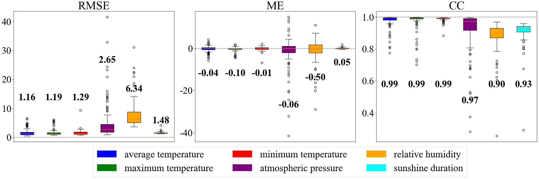 Figure 5Box plots of RMSE, ME, and CC for grid-modelled data of six meteorological element products and in-situ data.
