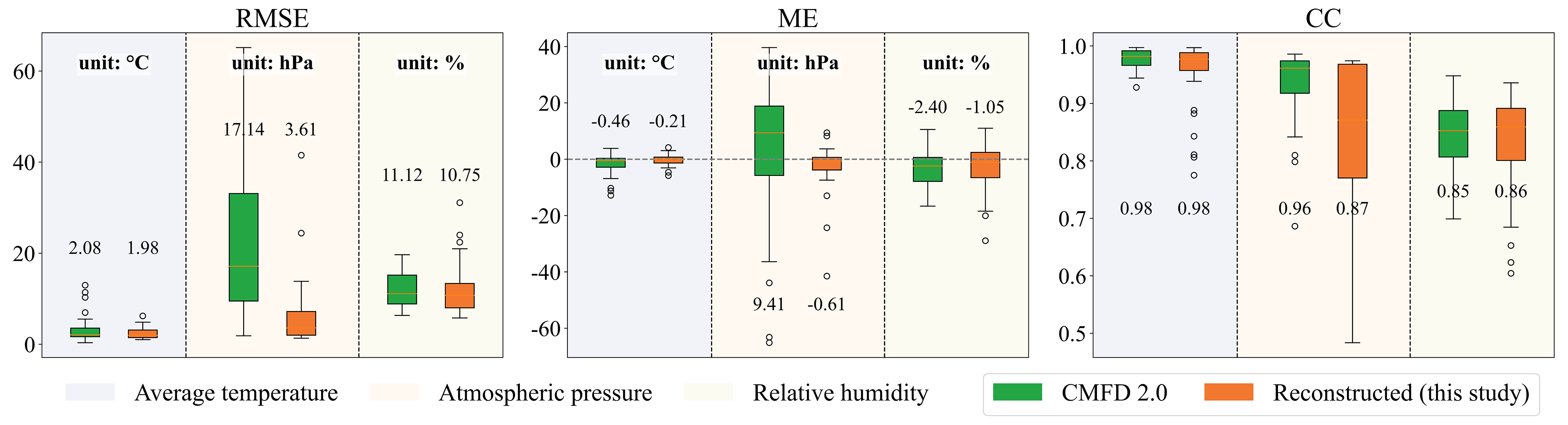 Figure 7Boxplot comparison of RMSE, ME, and CC for average temperature, atmospheric pressure, and relative humidity between CMFD 2.0 and the reconstructed dataset developed in this study.