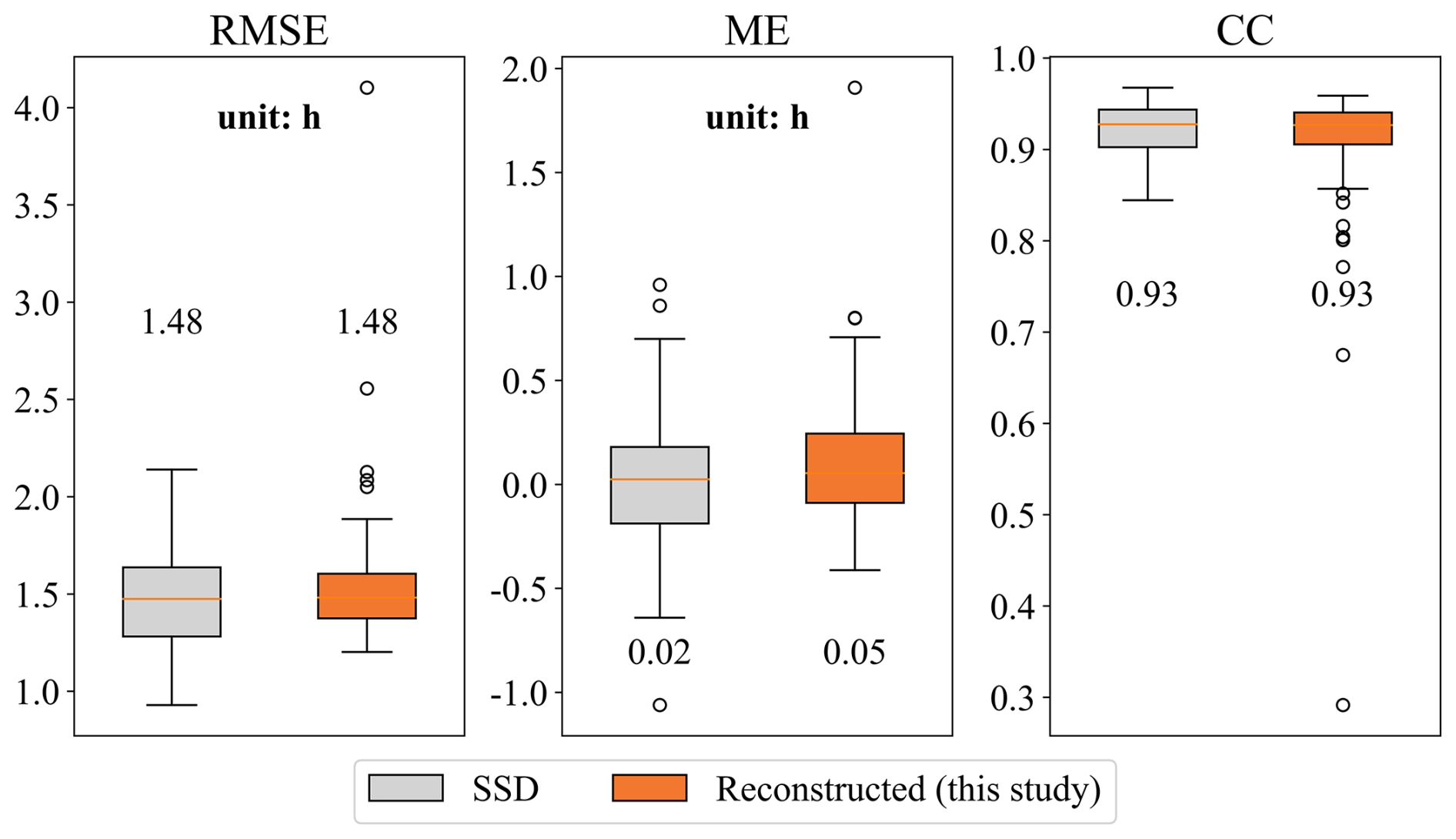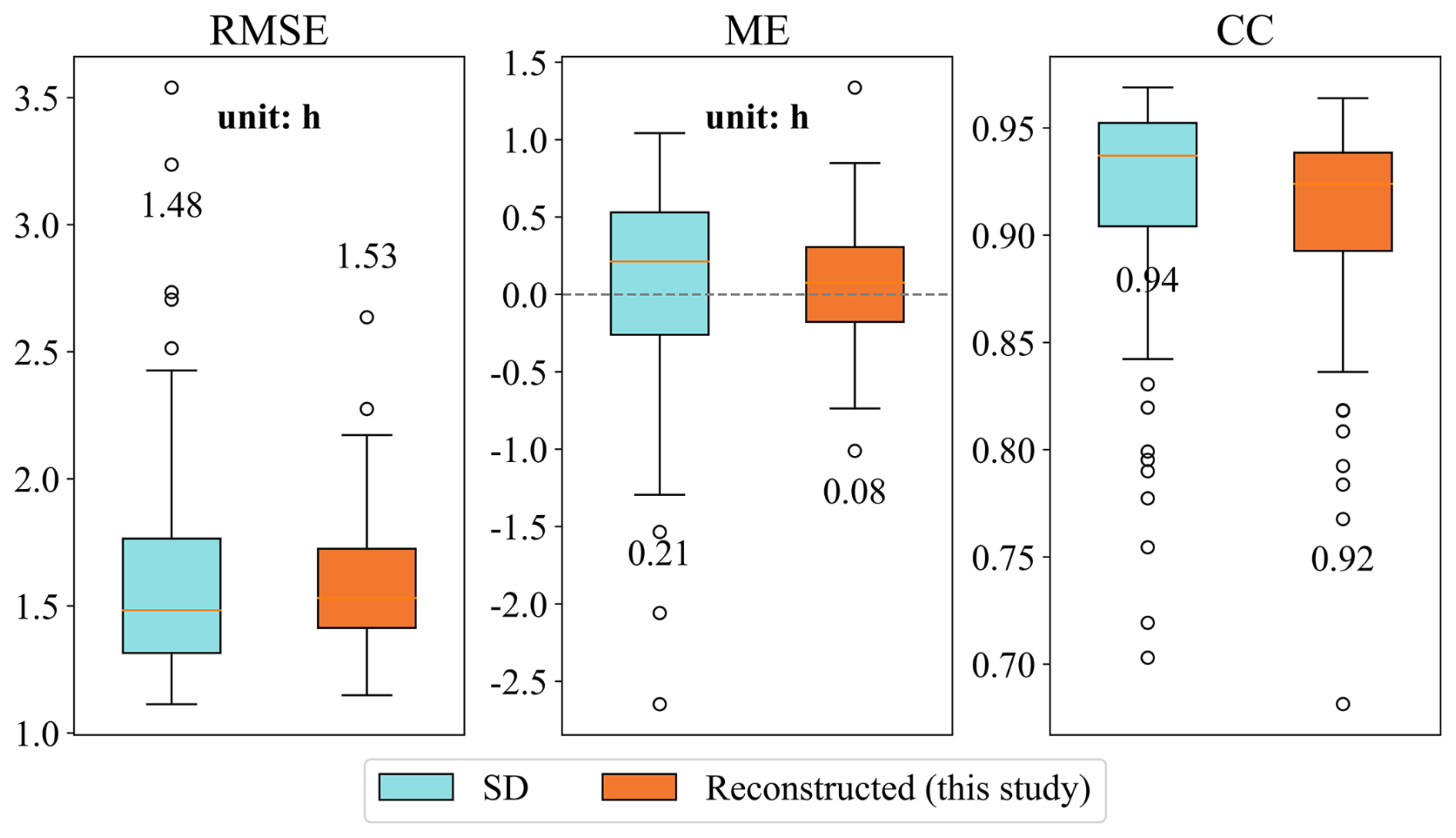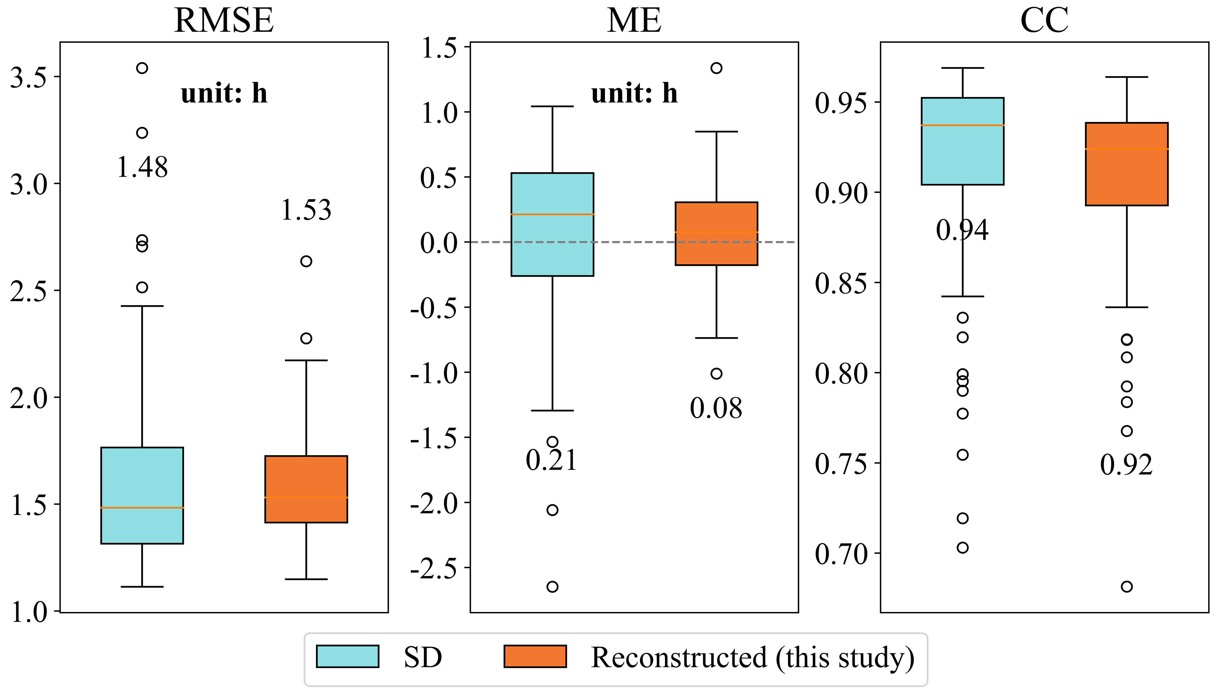 As shown in Fig. 8, when compared with the SSD dataset over 1961–2019, the reconstructed product demonstrated highly consistent accuracy. The median RMSE values were identical for both products (1.48 h), and the median CC values were likewise identical (0.93). The ME differed only slightly (0.05 h for the reconstructed dataset and 0.02 h for SSD), indicating comparable bias levels. Boxplot analysis further indicated that the reconstructed product exhibited slightly narrower interquartile ranges, whereas the SSD dataset showed fewer outliers in RMSE and CC. It should be noted that although some of the 95 CMA validation stations may have been included in the SSD development, our reconstruction model excluded these stations from training, ensuring a higher degree of validation independence.