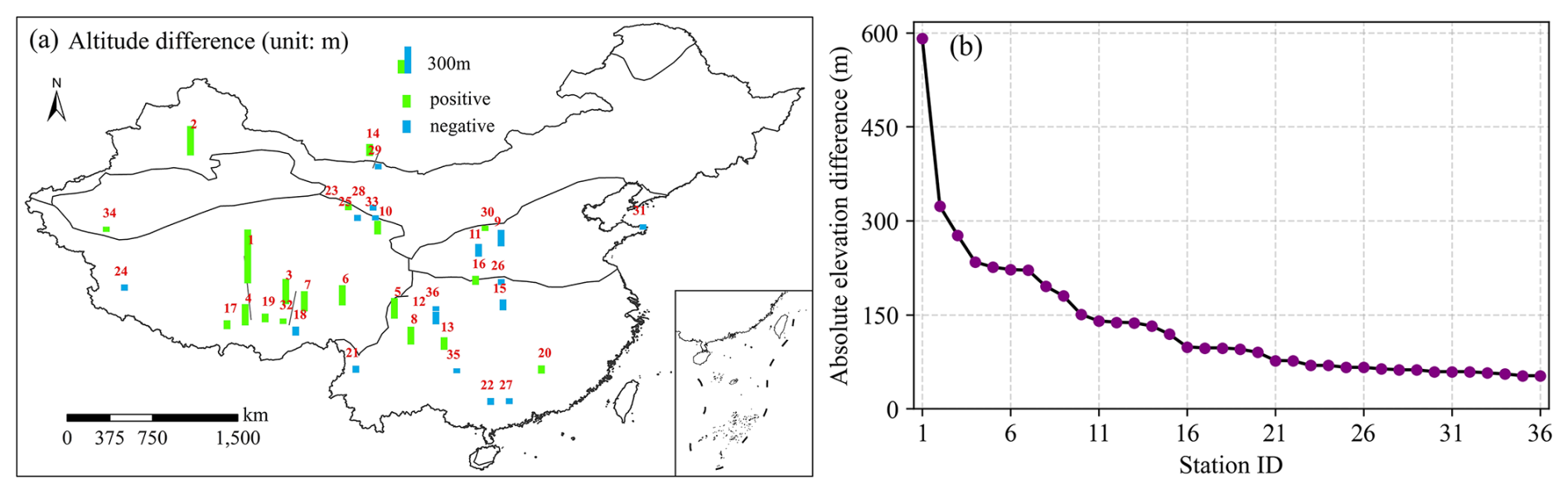 Figure 10Elevation differences between station elevations and corresponding DEM grid values: (a) spatial distribution, where red numbers denote station IDs with differences greater than 50 m; (b) point-line plot showing absolute elevation differences as a function of station ID.