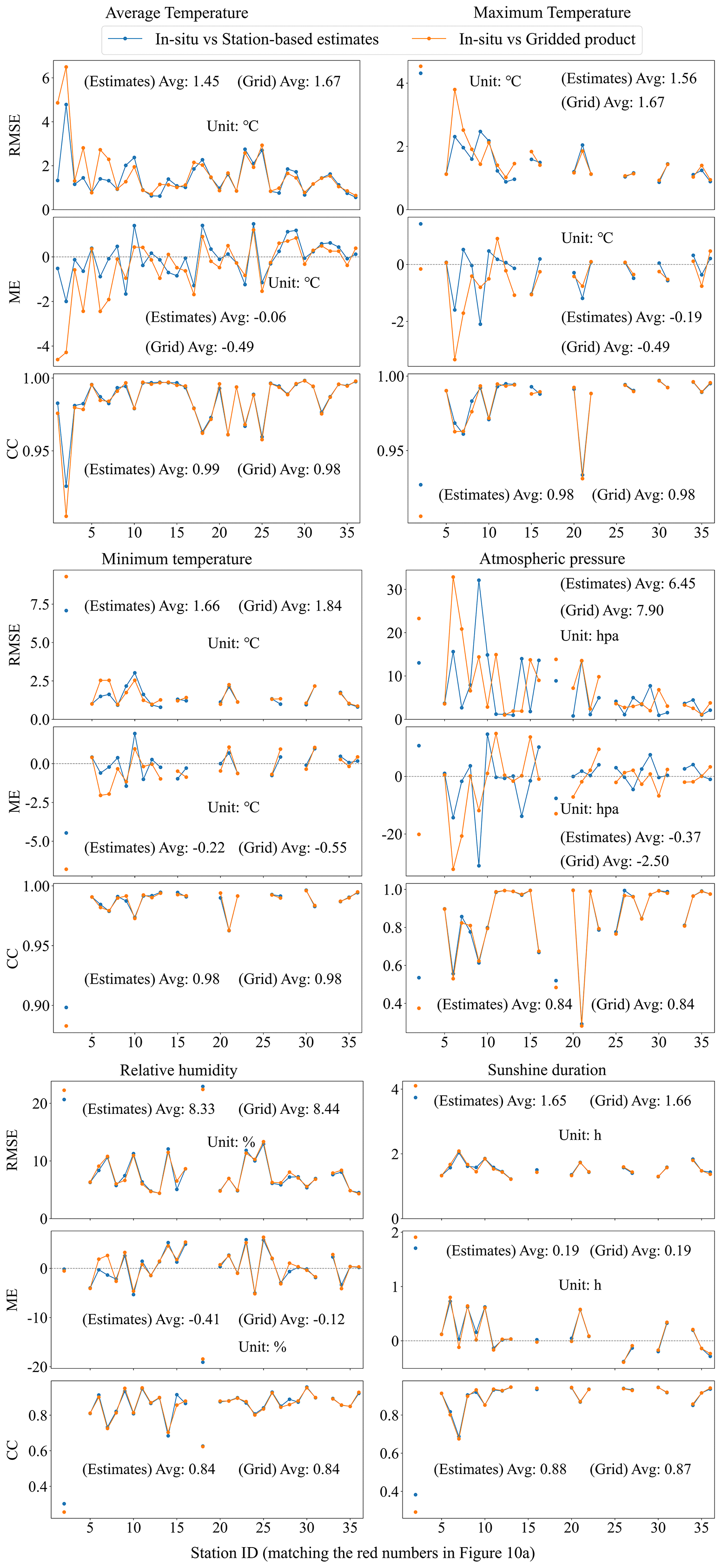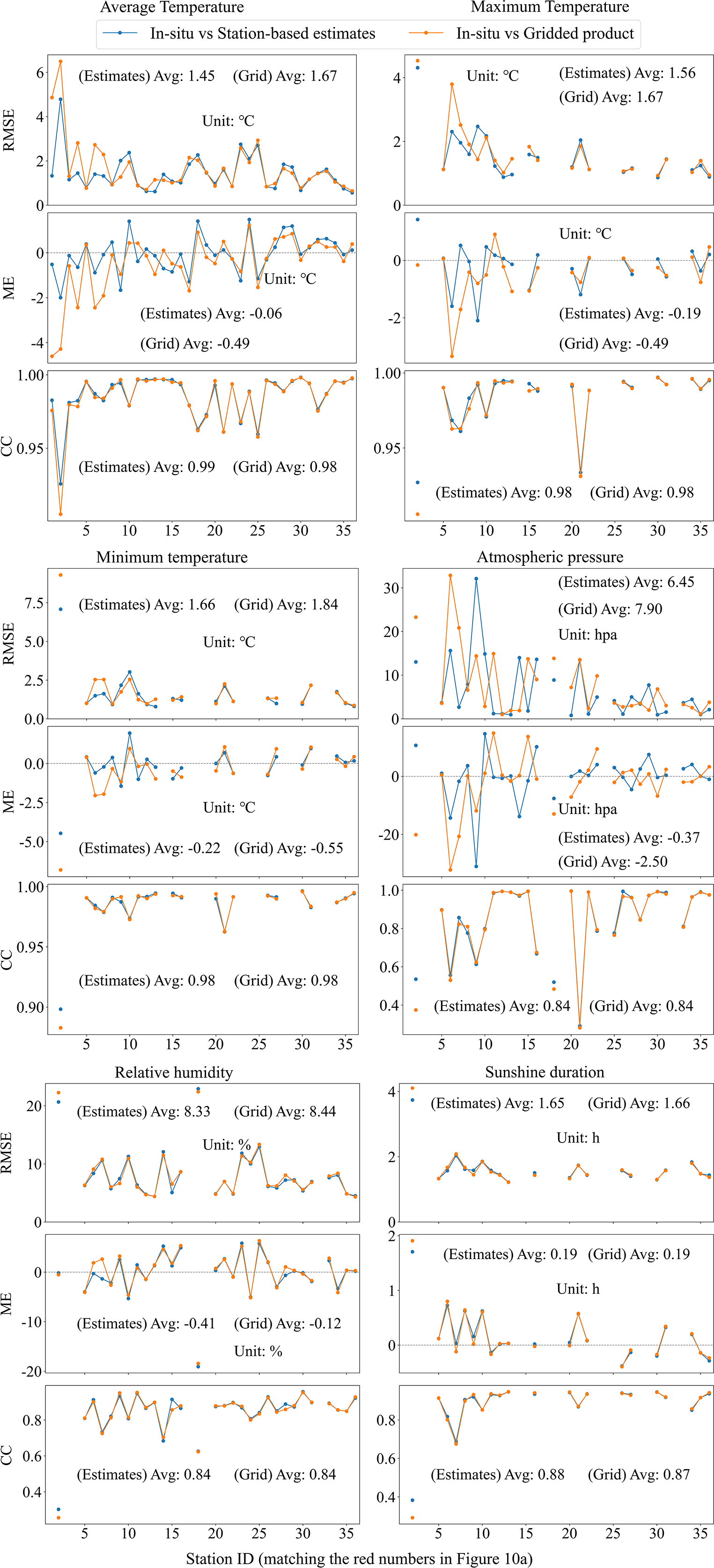 Figure 11Comparison of dotted line plots for RMSE, ME, and CC between in-situ data and station-based estimates, as well as between in-situ data and gridded data.