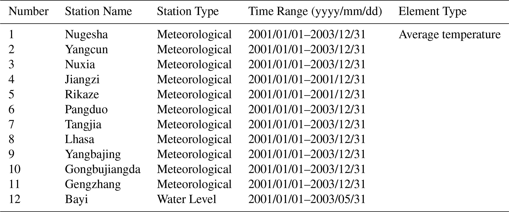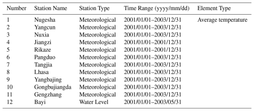 To address the limited spatial coverage of validation stations in the Tibet region, daily average temperature observations from 12 ground-based meteorological stations were obtained from the Department of Water Resources (DWR). These supplementary data enhance the robustness of model evaluation in western China. The locations of the DWR stations are shown in Fig. 1, and metadata for each station are provided in Table 1.
