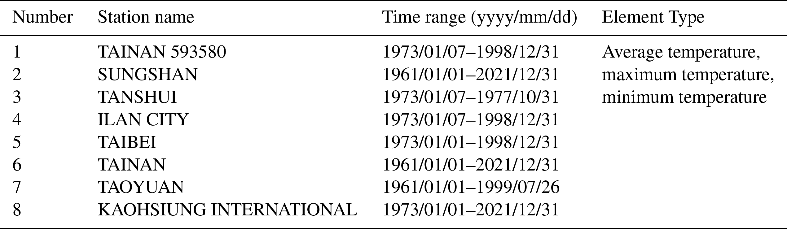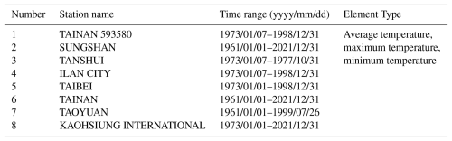 The Global Surface Summary of Day (GSOD) dataset, compiled by the National Centers for Environmental Information (NCEI), is based on international data exchanges conducted under the World Meteorological Organization (WMO) World Weather Watch Program. This dataset provides daily summaries of 18 surface meteorological variables from more than 9000 global stations, with records available from 1929 to the present. Observation data from eight meteorological stations in the Taiwan region were obtained from the NCEI online archive (https://www.ncei.noaa.gov/access/search/data-search/global-summary-of-the-day, last access: 25 November 2025) and processed for use in validation. Detailed metadata and data availability for these stations are summarized in Table 2.