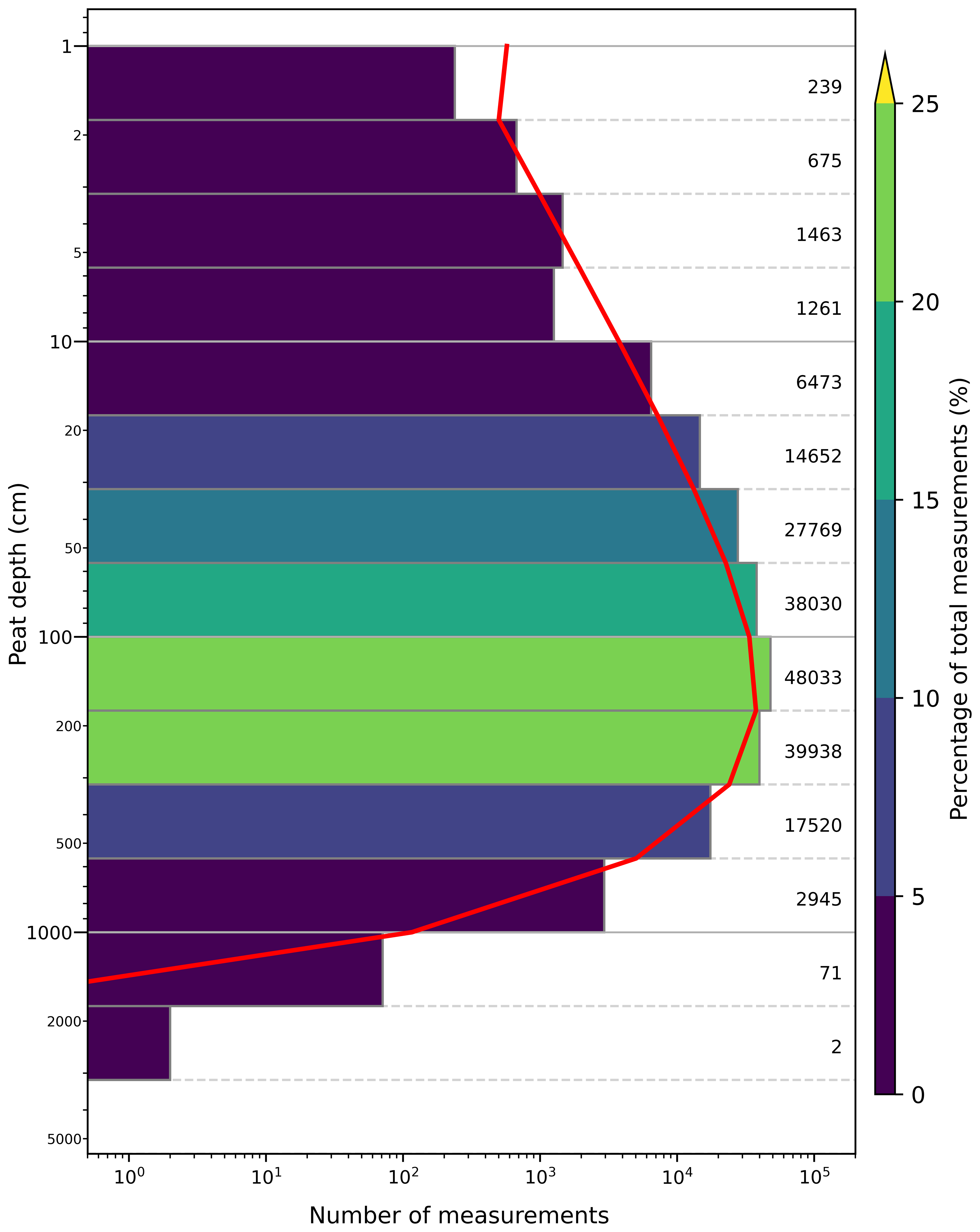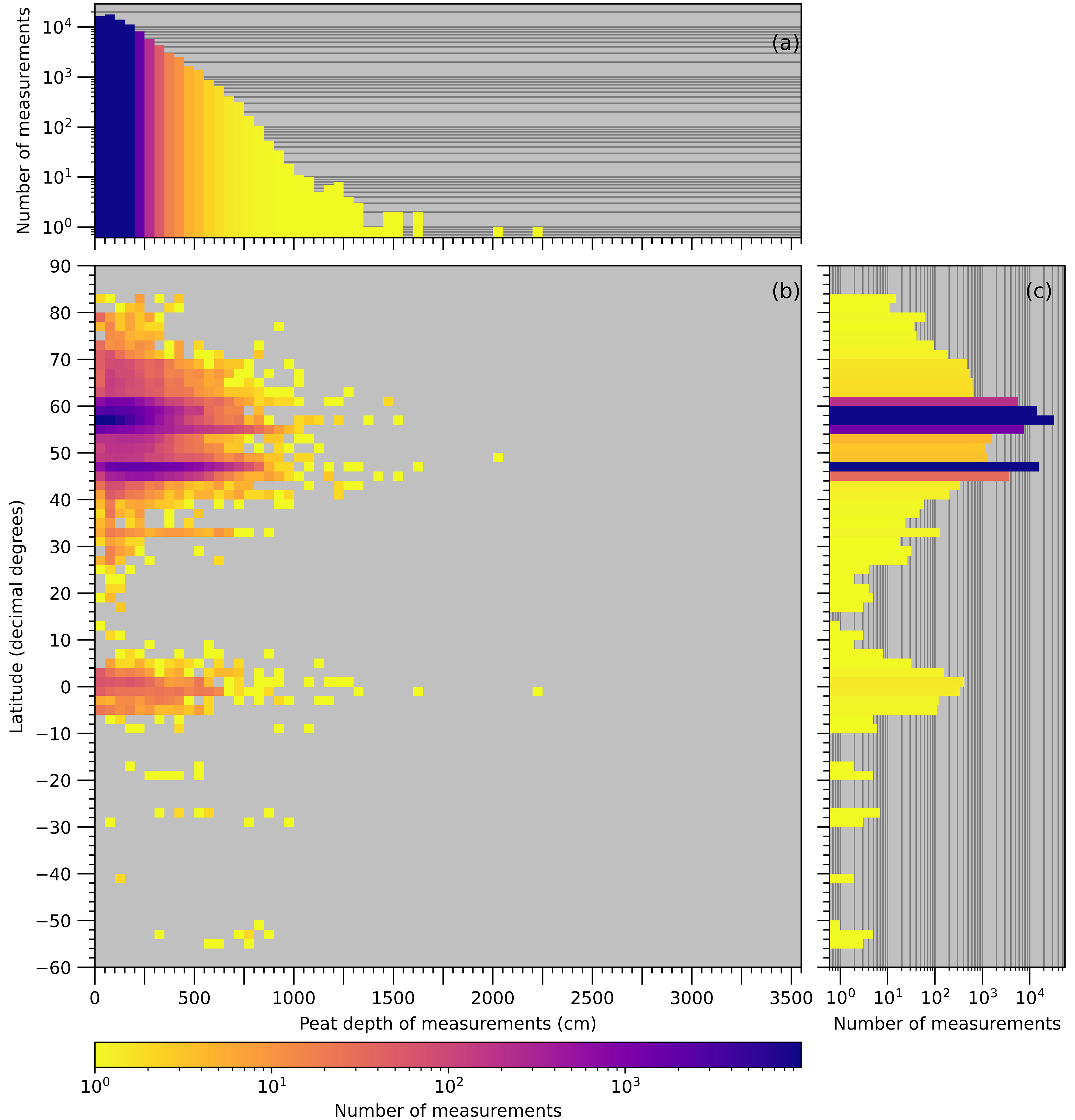 The distribution of measurements in Peat-DBase reflect the prominence of peatlands in boreal, temperate, and tropical regions (Xu et al.2018; Melton et al.2022; Joosten and Clarke2002; Koster and Favier2005). Looking beyond the high sample densities in New Brunswick and Scotland, Figs. 4 and 3 shows peat measurements concentrated in high latitudes (particularly 40–50° N) and near the equator. Additional clusters appear at intermediate latitudes, such as around 35° N, corresponding to peatland complexes in Florida and the Tibetan Plateau (Fig. 2a). The deepest recorded measurement within Peat-DBase (2223 cm) occurs in Uganda in the East African Highlands (Treat et al.2017).