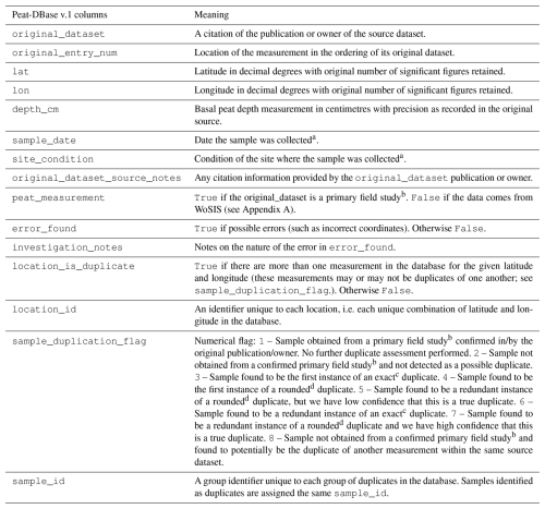 Table 1The sources of peat study measurements in Peat-DBase v.1. The final number indicates the number of measurements (n) retained after error/duplicate assessment (sample_duplication_flag values of 1–5; see Sect. 3.3 and Table 2). The percent column indicates what percent of the original number of cores was retained after error/duplicate assessment.