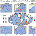 To provide a comprehensive representation, we present the vortex-profile matching on a global scale (center panel, Fig. 4). Although certain geographic regions display a high occurrence of eddies, most of the profiles lie outside them, even in highly energetic areas such as the Kuroshio, Gulf Stream, Brazil-Malvinas, and Agulhas (as shown in the zoomed-in panels in Fig. 4).