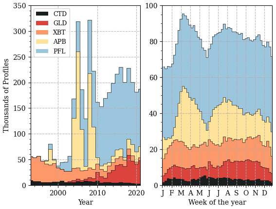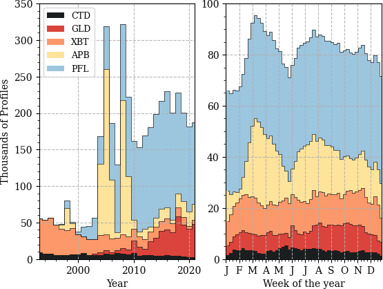 GLD, CTD, and XBT profiles do not display strong seasonality, although their occurrence is slightly reduced during holiday periods at the end and beginning of the year (Fig. 1). PFL profiles, despite appearing to exhibit some seasonality, remain relatively constant throughout the months. This apparent pattern is mainly influenced by the order of the cumulative plots. The only data type that shows a distinct seasonality is APB. Most APB profiles occur in March, April, July, and August, probably due to the seasonal behavior of the tagged animals.