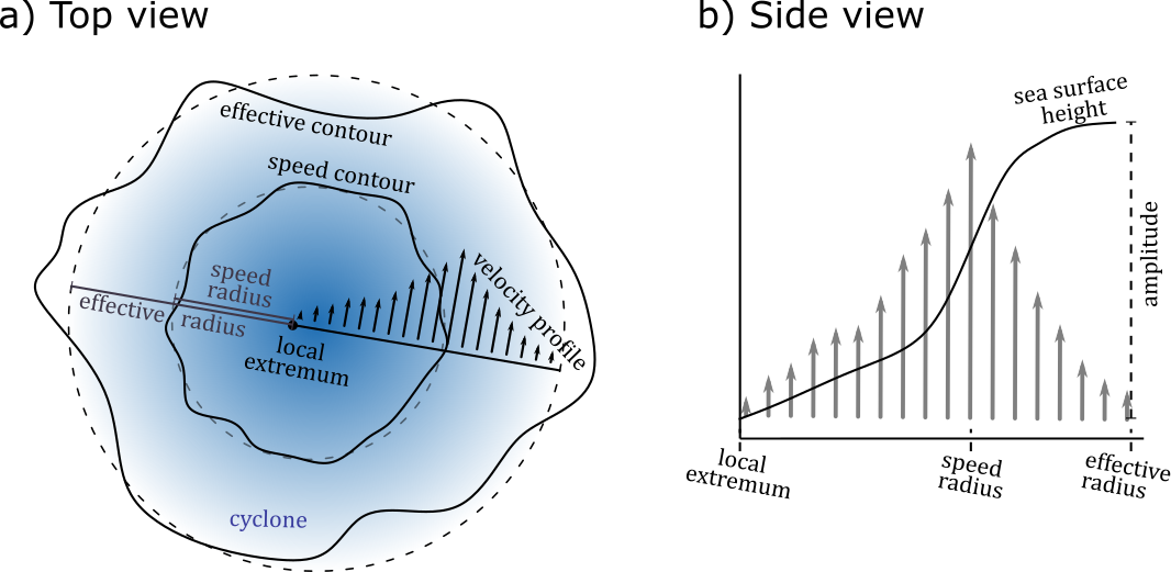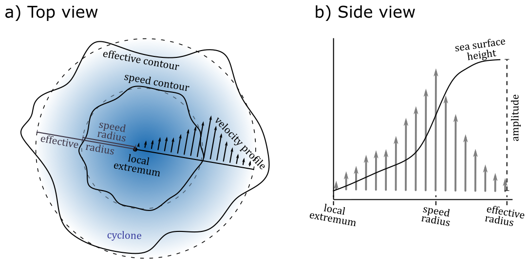 Speed contour: high-pass filtered closed contour of sea-surface height associated with maximum azimuthally averaged velocity detected from a search starting the localized sea-level extremum.