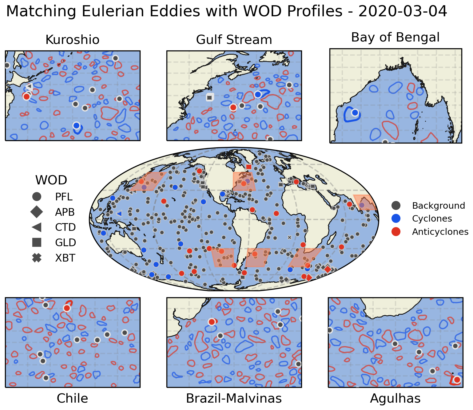 Figure 4Global distribution of WOD profiles on 4 March 2020. Each data type is represented by a specific marker: circle (PFL), diamond (APB), triangle (CTD), square (GLD), and X (XBT). Profiles within anticyclones are marked in red, profiles within cyclones in blue, and background profiles in gray. Zoomed panels highlight six regions: Kuroshio, Gulf Stream, Bay of Bengal, Chilean coast, Brazil-Malvinas, and Agulhas. The panels display profiles and eddy speed contours, with thicker lines indicating eddies containing at least one profile. An animated version is available at https://www.youtube.com/watch?v=9xzhtrzLRdo (Simoes-Sousa, 2025).