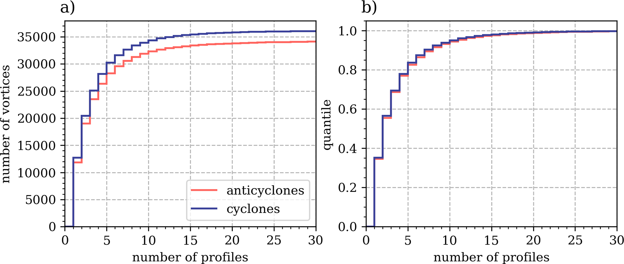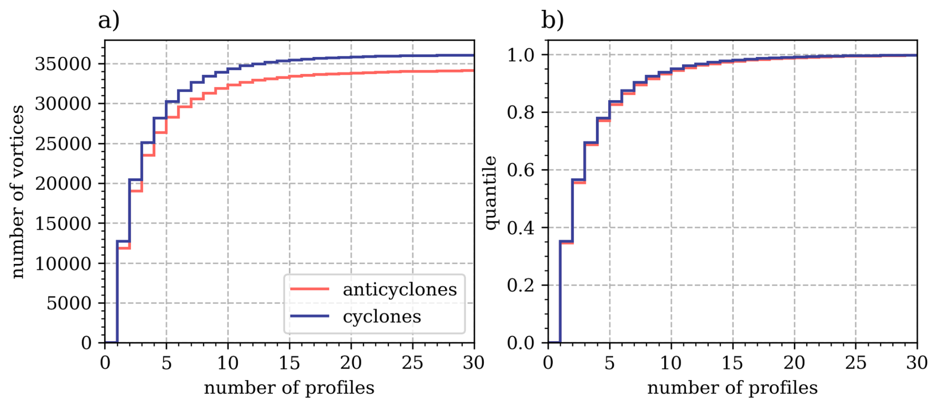 Figure 5Cumulative distribution for the absolute (a) and relative (b) total number of PFL profiles over the full lifetime of unique anticyclones (red) and cyclones (blue).