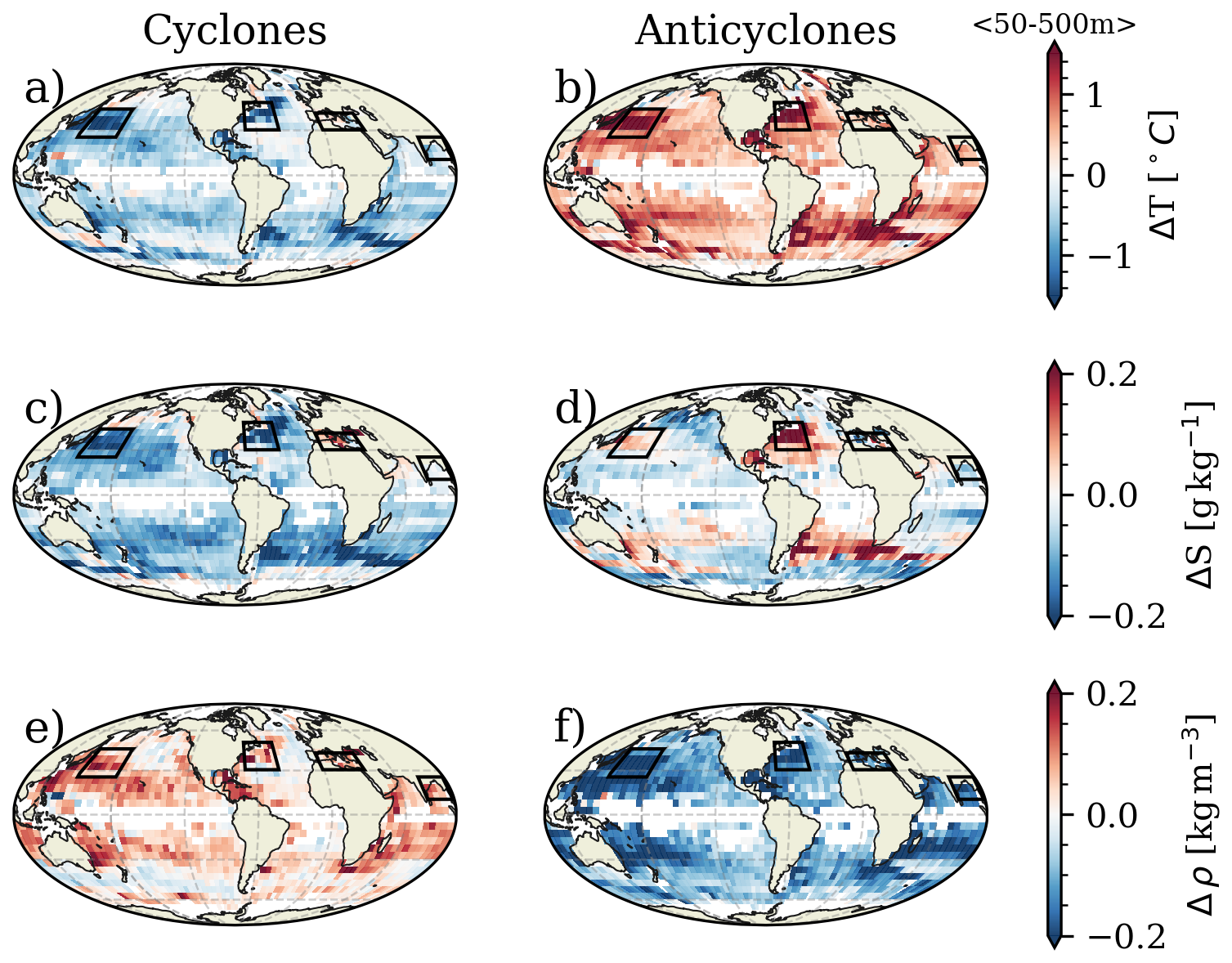 Figure 6Global distributions of anomalies in conservative temperature (°C, panels (a) and (b)), absolute salinity (g kg−1, (g), (c) and (d)), and potential density (kg m−3, (e) and (f)) within cyclones (a, c, e) and anticyclones (b, d, f). The anomalies correspond to median profiles computed within 5×5° boxes subsequently averaged between depths of 50 and 500 m. The black solid lines indicate the regions where the vertical distribution of properties was analyzed. Boxes with less than 10 profiles are masked.