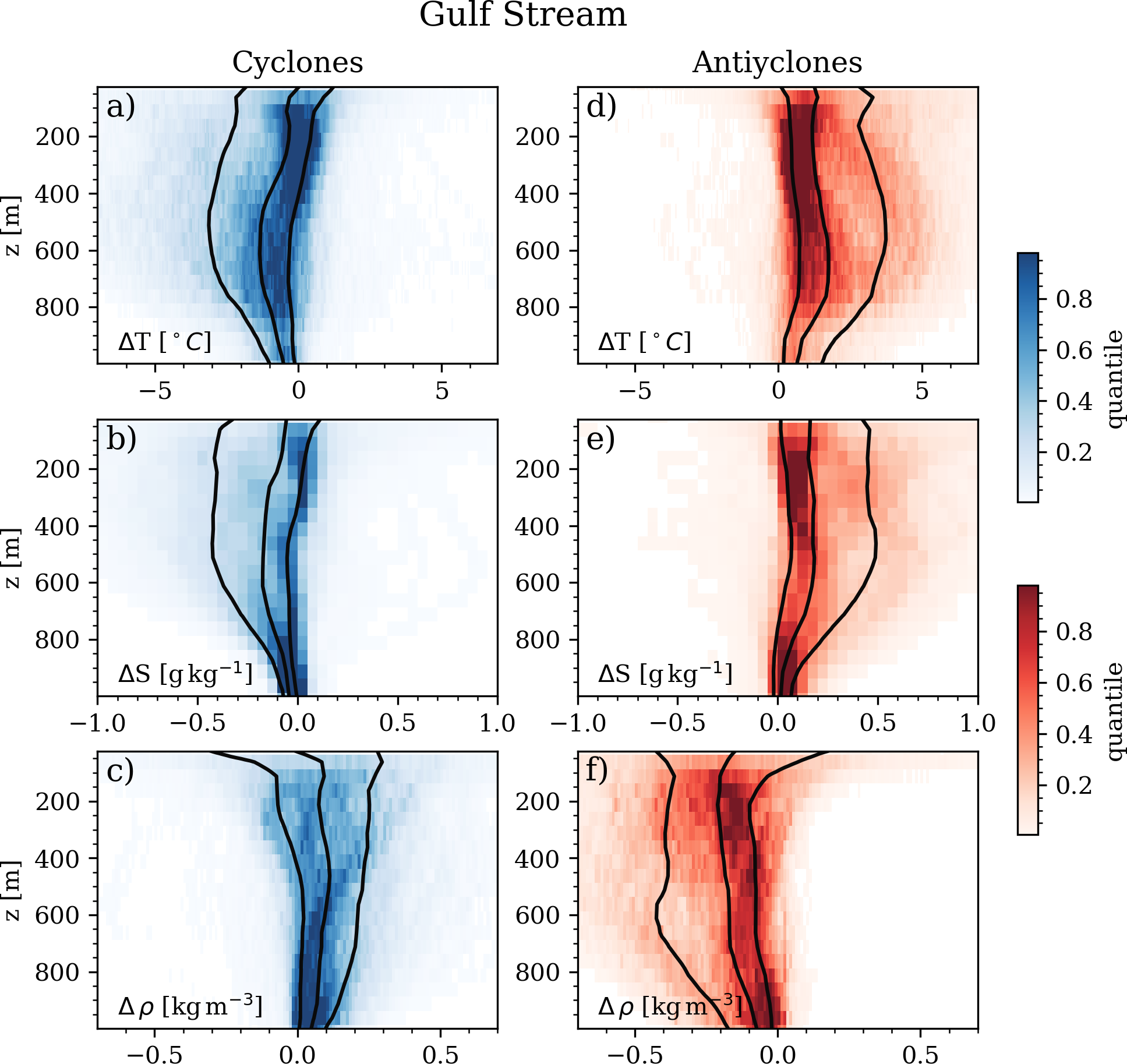 Figure 7Median anomalous vertical profile conservative temperature (°C, panels (a) and (d)), absolute salinity (g kg−1, (b) and (e)), and potential density (kg m−3, (d) and (f)) within cyclones (a, b, c) and anticyclones (d, e, f) for the Gulf Stream region. Black solid lines represent the 20th, 50th and 80th percentiles.