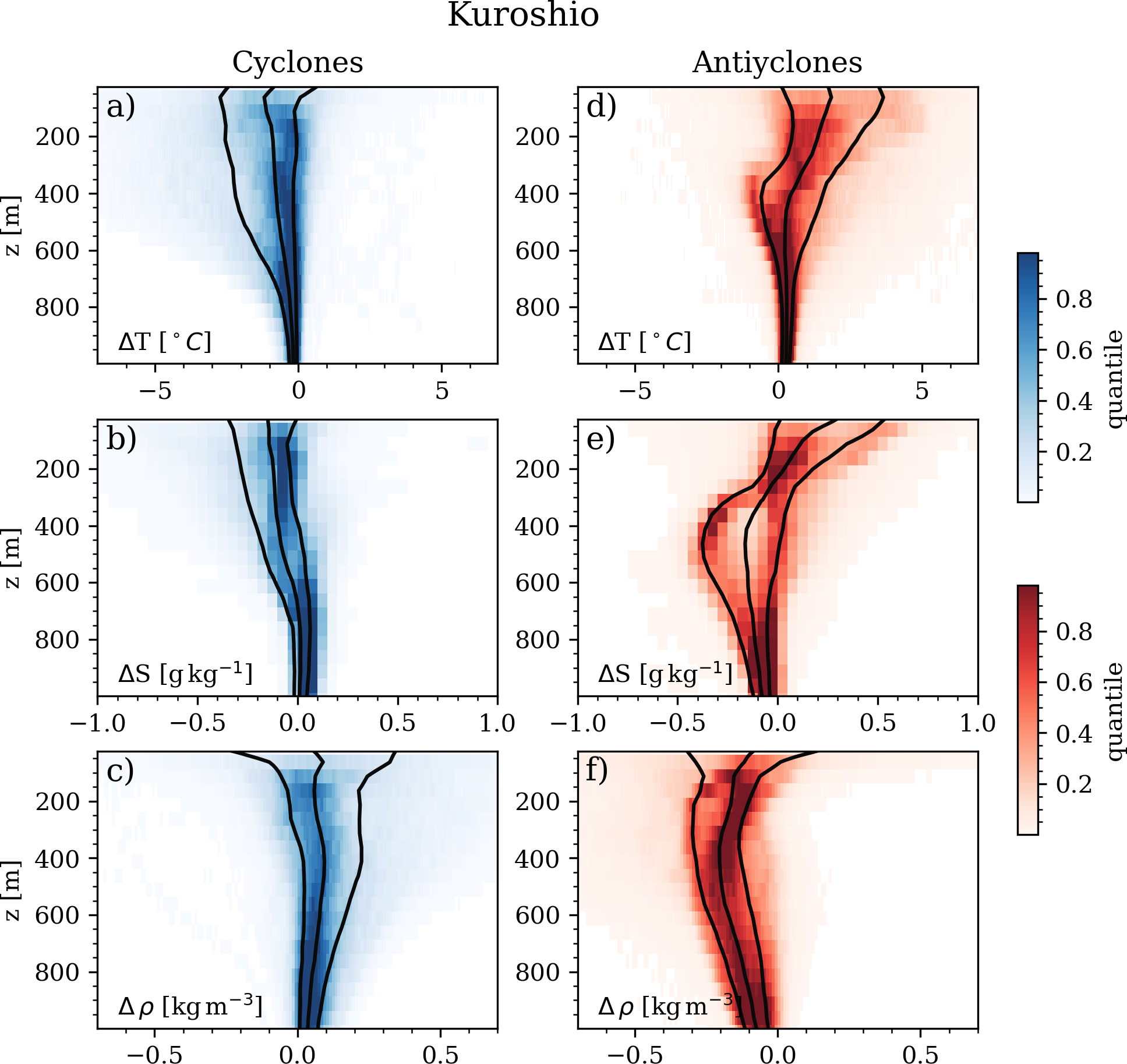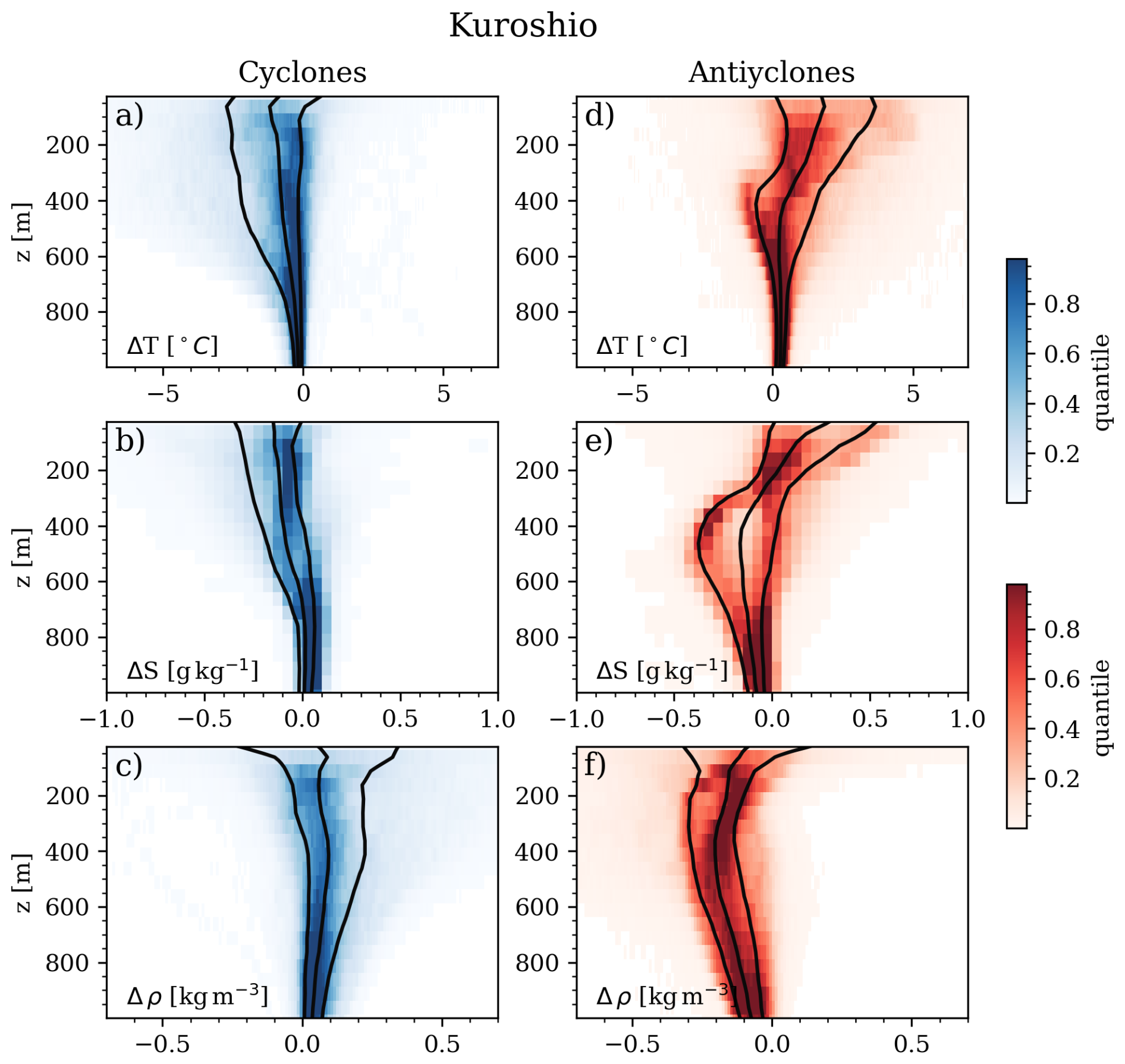 Figure 8Median anomalous vertical profile conservative temperature (°C, panels (a) and (d)), absolute salinity (g kg−1, (b) and (e)), and potential density (kg m−3, (d) and (f)) within cyclones (a, b, c) and anticyclones (d, e, f) for the Kuroshio Current region. Black solid lines represent the 20th, 50th and 80th percentiles.