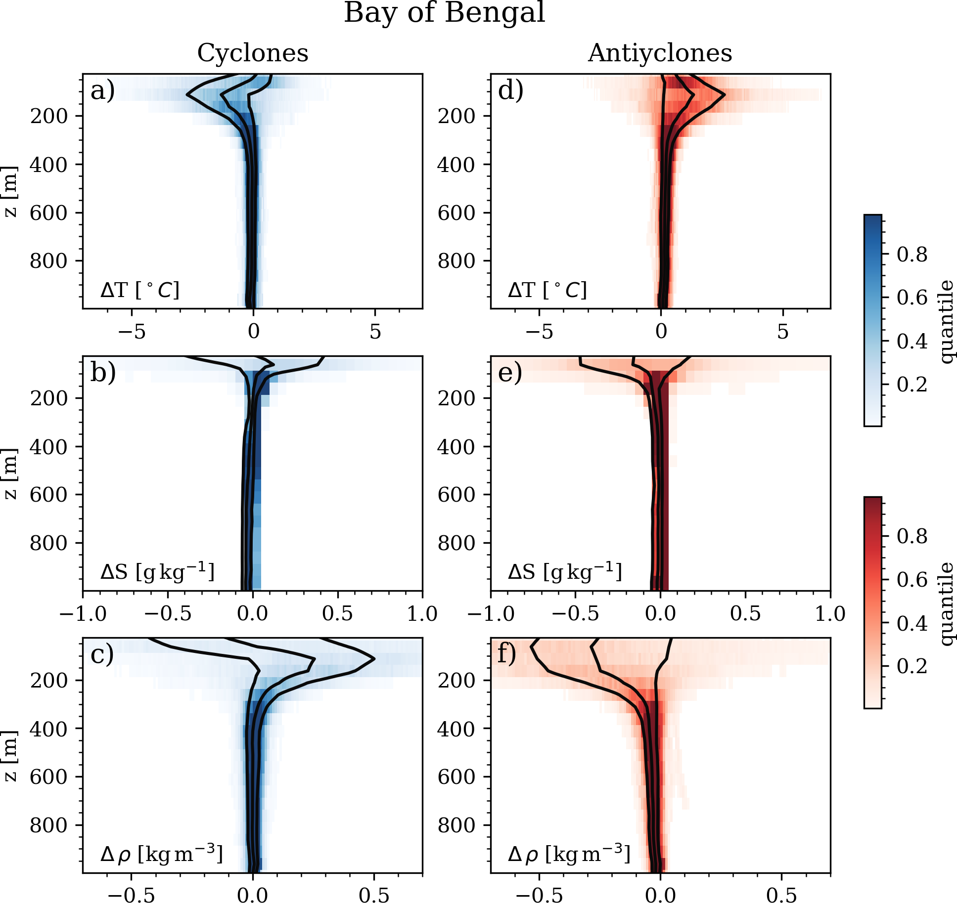 Figure 9Median anomalous vertical profile conservative temperature (°C, panels (a) and (d)), absolute salinity (g kg−1, (b) and (e)), and potential density (kg m−3, (d) and (f)) within cyclones (a, b, c) and anticyclones (d, e, f) for the Bay of Bengal region. Black solid lines represent the 20th, 50th and 80th percentiles.