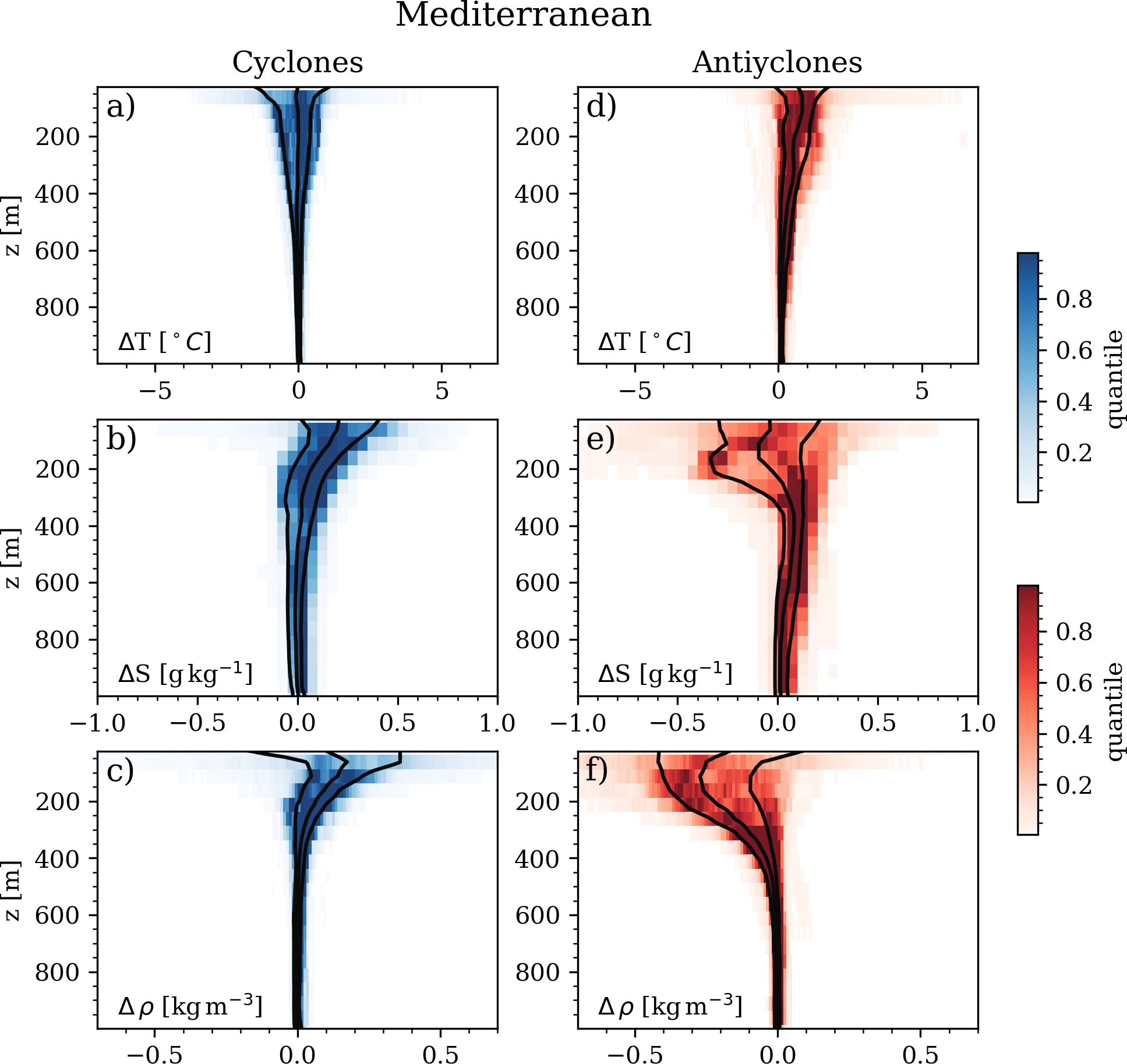 Figure 10Median anomalous vertical profile conservative temperature (°C, panels (a) and (d)), absolute salinity (g kg−1, (b) and (e)), and potential density (kg m−3, (d) and (f)) within cyclones (a, b, c) and anticyclones (d, e, f) for the Mediterranean Sea region. Black solid lines represent the 20th, 50th and 80th percentiles.