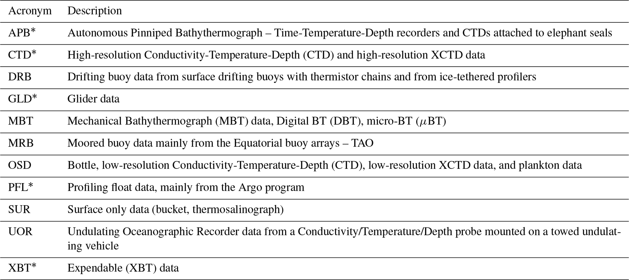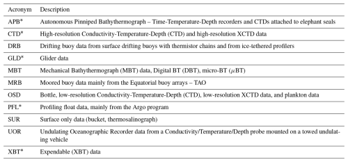 The World Ocean Database (WOD) is a globally extensive and unrestricted collection of ocean profile data maintained by the National Oceanic and Atmospheric Administration (NOAA) (Boyer et al., 2018). It encompasses a wide range of parameters, including temperature, salinity, chlorophyll, dissolved oxygen, and nutrient concentrations, recorded at various depths throughout the world's oceans (Boyer et al., 2018). With quality control flags attached to the data, the WOD ensures the reliability and accuracy of the measurements. WOD covers different data types and instruments. For this study, we used instruments carried by elephant seals (APB), traditional high-resolution CTD and XCTD casts (CTD), glider data (GLD), profiling float data (e.g., Argo floats) (PFL) and XBT casts (XBT) from 1993 to 2022 (overlapping with satellite altimetry data). See Table 1 for the full description for all data types.