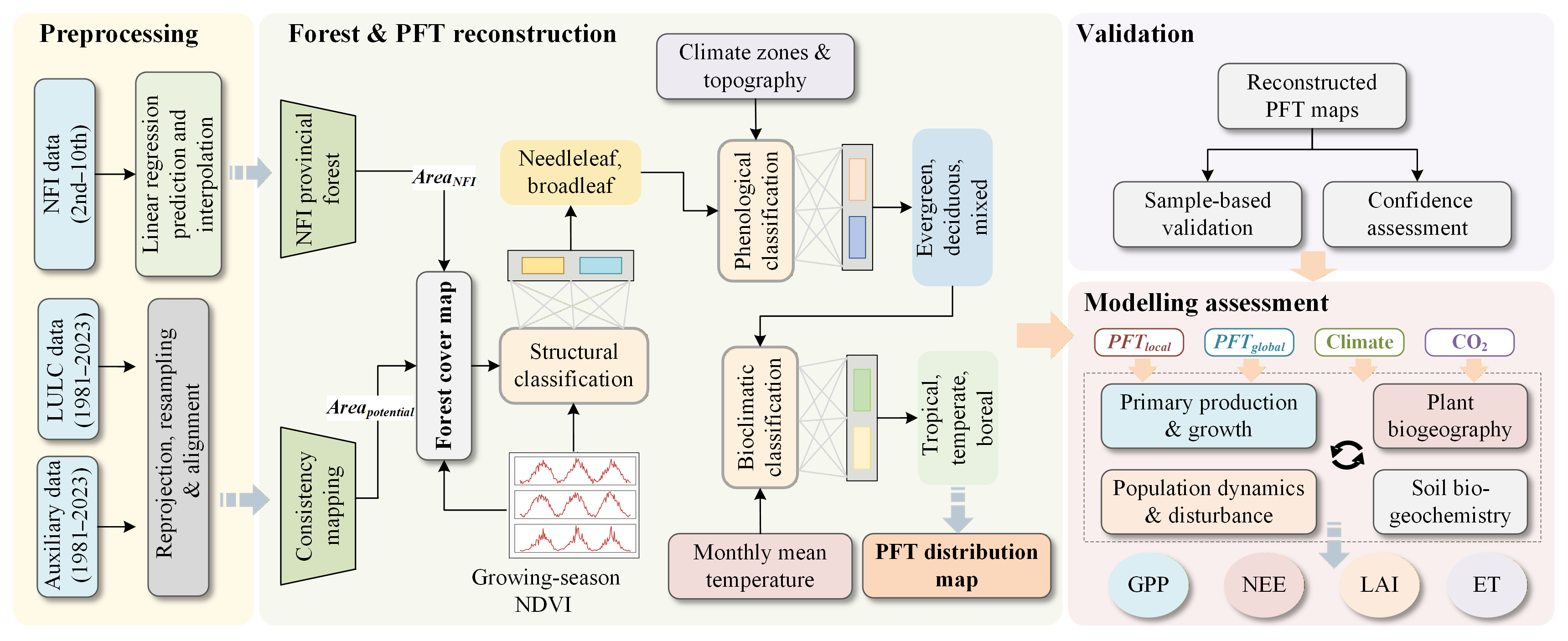 The framework for mapping forest cover and PFTs is shown on Fig. 1. It includes the interpolation of NFI statistical data, reconstruction of annual PFTs, validation, and modelling assessment. We constructed annual forest cover maps of China for the period 1981–2023 by integrating multiple data sources and derived PFTs through a sequential, multistep process. First, forest life forms were classified using a method analogous to that used in forest cover reconstruction; second, phenological characteristics were derived; and finally, these intermediate classifications were subdivided into the final PFTs on the basis of a set of climatic rules. Finally, the accuracy of the reconstructed dataset was assessed using validation samples from field surveys and independent reference data, and its consistency was analysed against existing LULC datasets. In particular, the reconstructed PFT dataset was used to drive a DGVM to evaluate the effectiveness of using the updated PFTs in simulating a series of surface fluxes by comparing the result with those obtained from simulation using the global PFT dataset from the ESA CCI (Harper et al., 2023) and the MCD12Q1 dataset (Sulla-Menashe et al., 2019).