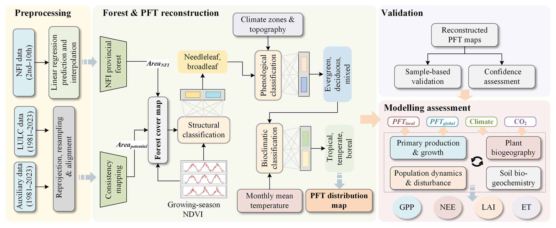 At both global and national scales, dynamic global vegetation models (DGVMs) typically represent key vegetation processes – such as photosynthesis and evapotranspiration – using a simplified classification of globally representative plant functional types (PFTs) that exhibit similar ecological and physiological traits (Gregor et al., 2024; Bergkvist et al., 2025); they are typically defined by traits such as photosynthetic pathway (), leaf morphology (needleleaf/broadleaf), and phenology (evergreen/deciduous) (Islam et al., 2024). Research has shown that explicitly incorporating forest restoration processes into DGVMs is critical not only for quantifying their feedback on the carbon cycle, surface energy balance, and climate system but also for providing a science-based foundation for policy assessment (Yue et al., 2024; Peng et al., 2024a). To accurately simulate carbon dynamics and vegetation succession, these models need to be driven by annually updated PFT distribution data (Pugh et al., 2024). However, a high-resolution, annual time series dataset that accurately reflects the PFT composition and spatial distribution during China's recent forest restoration is currently lacking (Yu et al., 2022; Xia et al., 2023). Most existing forest cover products provide either single-year classifications or PFT information at a coarse temporal resolution, failing to meet the annual input requirements of DGVMs (Ran et al., 2012). Furthermore, they often fail to capture the forest recovery trends documented by the NFI. While some recent studies have developed NFI-based reconstructed forest datasets, these products are typically either too coarse in spatial resolution, do not provide the distribution of individual PFTs, or are not temporally continuous, with maps produced only every few years (Yu et al., 2022; Xia et al., 2023). Therefore, there is an urgent need to generate NFI-consistent, high-resolution, and annually resolved long-term maps of both forest cover and the PFT distribution. Such a dataset is fundamental for robustly assessing China's forest carbon sink and its driving factors using ecosystem models.