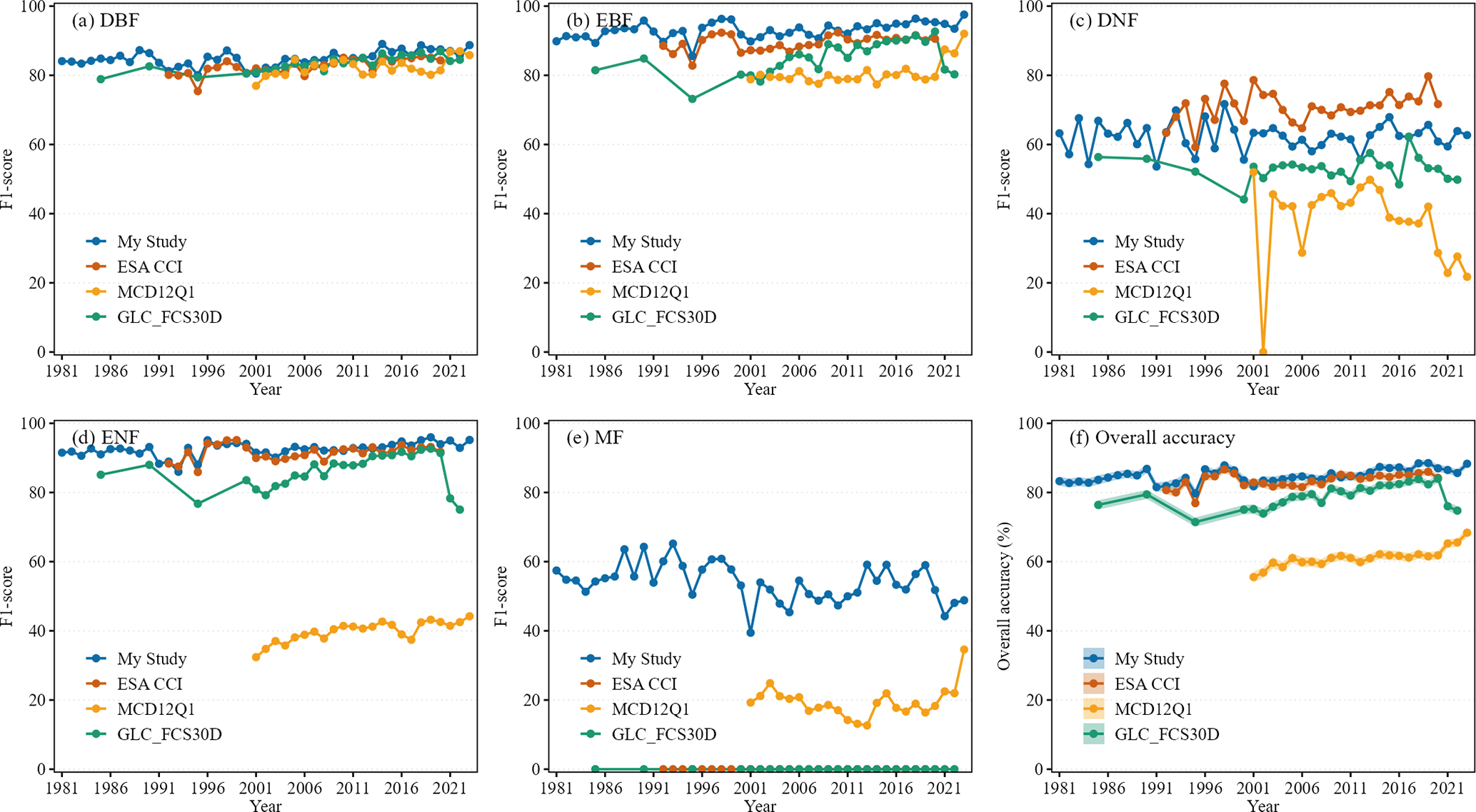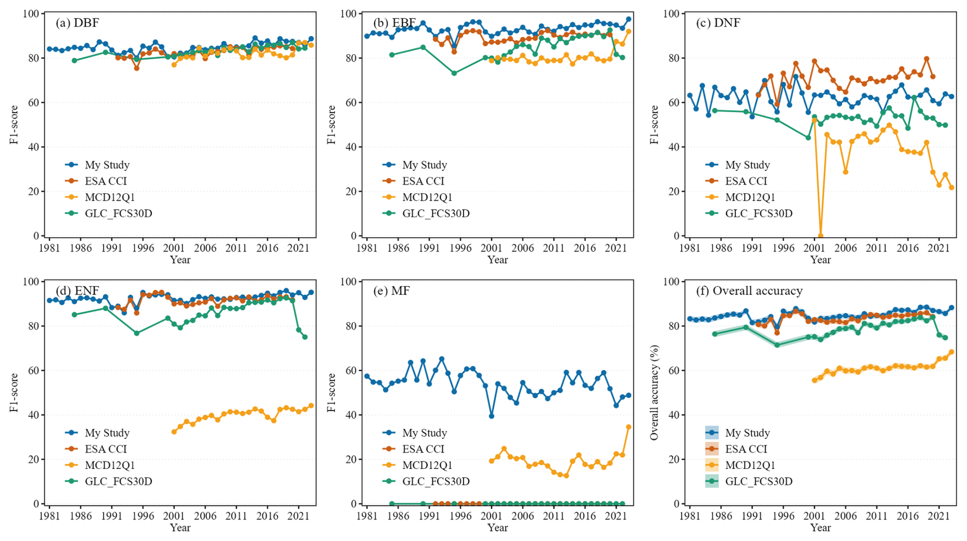 Figure 2F1 scores and overall accuracies (OAs) for our dataset (this study), the European Space Agency Climate Change Initiative land cover (ESA CCI) dataset, the Moderate Resolution Imaging Spectroradiometer land cover (MCD12Q1) dataset, and the global 30 m land-cover dynamics monitoring dataset (GLC_FCS30D), which were validated against national forest inventory (NFI) field plots. The shaded area in (f) represents ± 1 standard error.