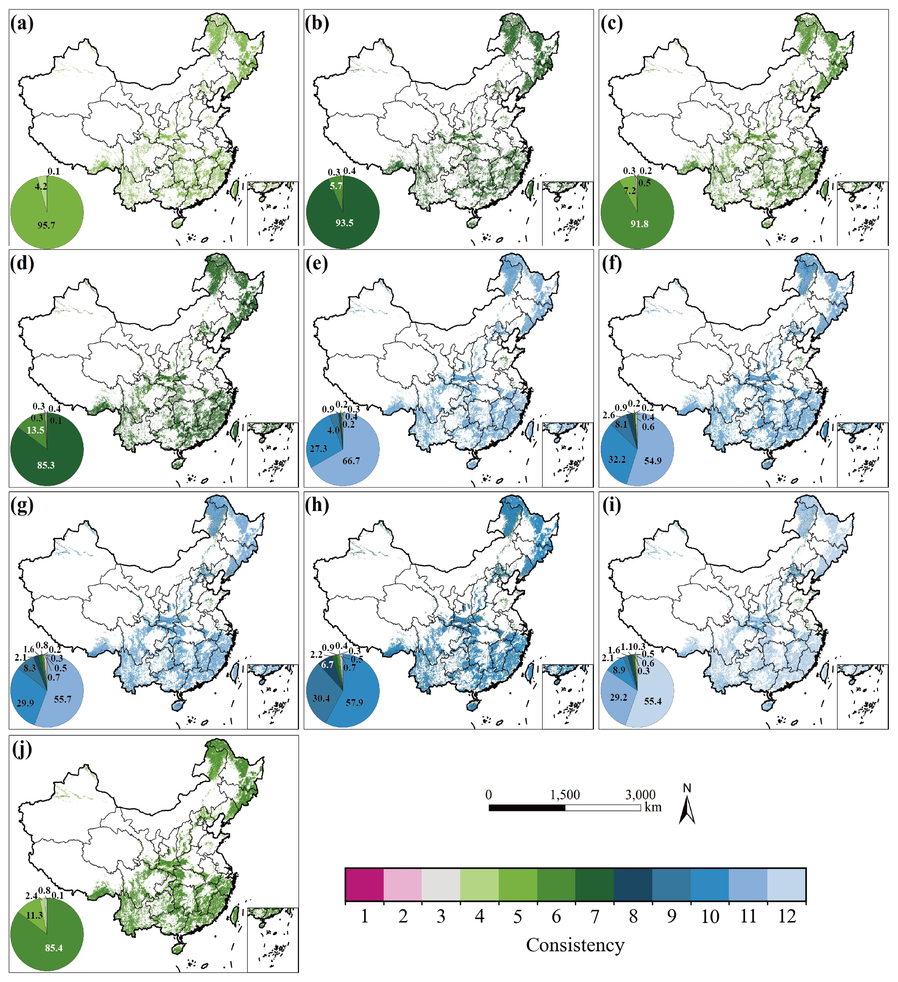 In this study, a data-driven “forest consistency” method was developed to reconstruct historical forest cover (Fig. 1). The method involved overlaying all available LULC datasets for each year (Fig. S4). For any given pixel, “consistency” (CON) was defined as the number of datasets in which the pixel was classified as forestland (Fig. S5a). A pixel was subsequently identified as a “potential forest pixel” if it was classified as forest in at least one dataset (i.e., CON > 0). The consistency value was then used to establish priority, whereby a high CON value indicated a high likelihood of the pixel representing true forest cover (Xia et al., 2023; Fang et al., 2020).