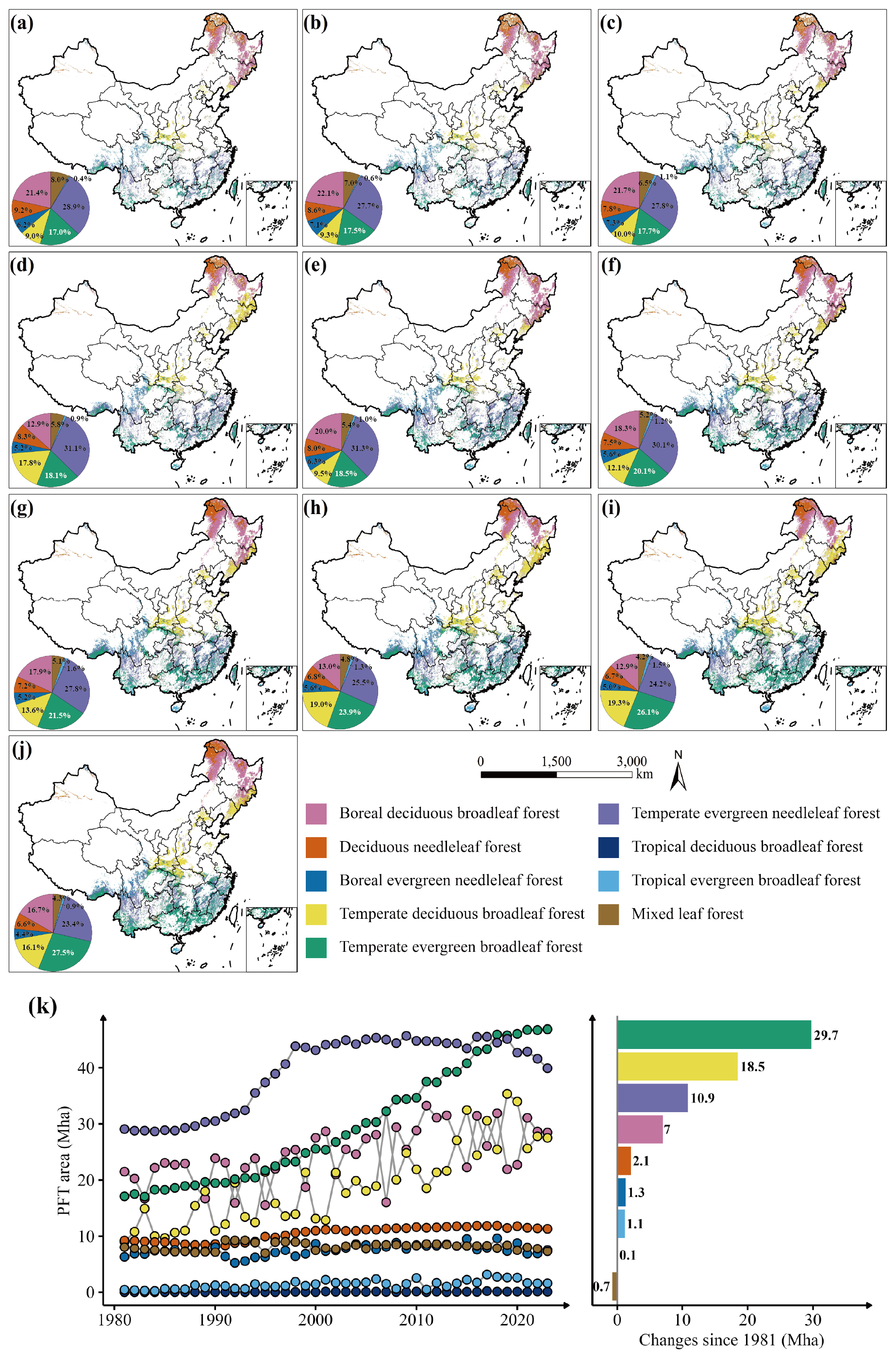 Through the sequence of methods detailed above, a comprehensive historical dataset of forest cover for China, classified on the basis of PFT, was produced.