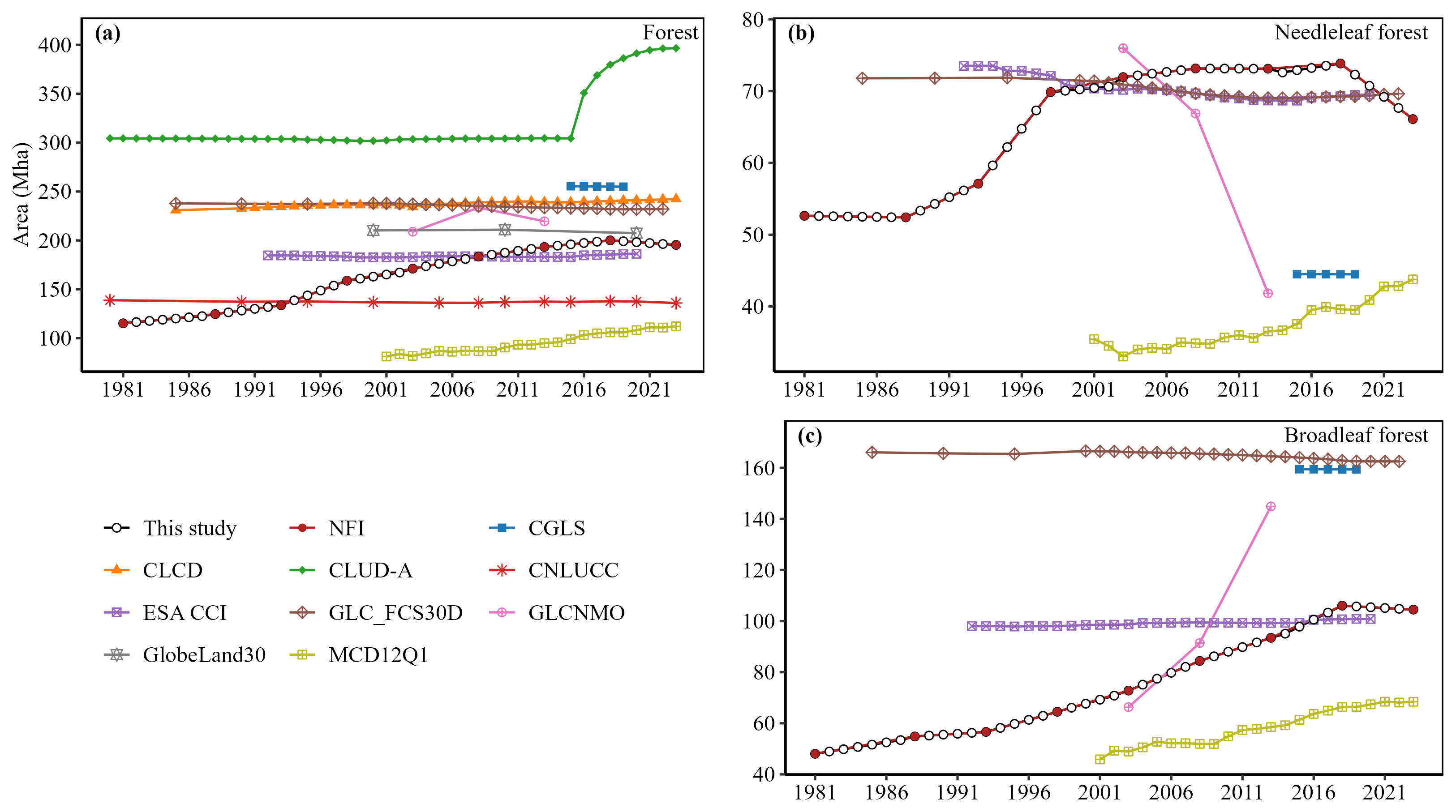 Although remote sensing has greatly improved the availability of land use and land cover (LULC) data, discrepancies among different datasets regarding the estimation of China's forestland area have led to large uncertainties in modelling (Tu et al., 2024; Zhu et al., 2025); for instance, three- to fivefold differences in estimates of China's terrestrial carbon storage have been reported from similar bookkeeping models (e.g., 17–33 Pg C vs. 6.18 Pg C from 1700 to 2000) (Houghton and Hackler, 2003; Ge et al., 2008). Cross-dataset comparisons highlight the scale of this issue: estimates of China's forestland area for the year 2010 from five different forest datasets ranged from 1.74 to 2.27 million km2, a relative difference of 29 % (Qin et al., 2015). Peng et al. (2024b) compared eight LULC datasets for the year 2020 and reported a maximum discrepancy of 0.34 million km2, an amount equivalent to 15 % of the area reported by the national forest inventory (NFI). This interproduct inconsistency is notable, as it appears to be inconsistent with the widely reported trend of forest expansion in China. According to NFI data, the nation's forestland area more than doubled from 1.15 million km2 in 1981 to 2.31 million km2 by 2021 (IDS, 2018). This trend is consistent with broader assessments by the Food and Agriculture Organization (FAO) of the United Nations, which attributed the shift in Asia's forest balance from a net loss in 1990–2000 to a marked net gain in 2000–2010 primarily to China's sustained afforestation efforts (FAO, 2016). However, long-term satellite-based LULC products often fail to capture this marked increase (Yang and Huang, 2021a). For example, the GlobeLand30 product shows a relatively small expansion of 5700 km2 between 2000 and 2020 (Chen et al., 2015), while the national land cover database of China (NLCD–China) indicates a net loss of 14 000 km2 from 2001 to 2015 (Wei et al., 2024). Consequently, owing to these differences among datasets, the contribution of the LULUCF sector to China's regional carbon budget is subject to uncertainty (Xia et al., 2023; Yu et al., 2022).