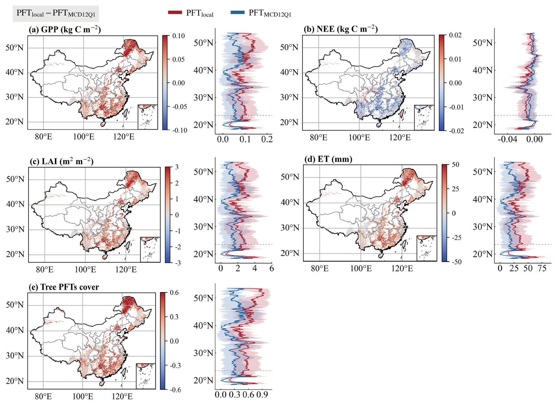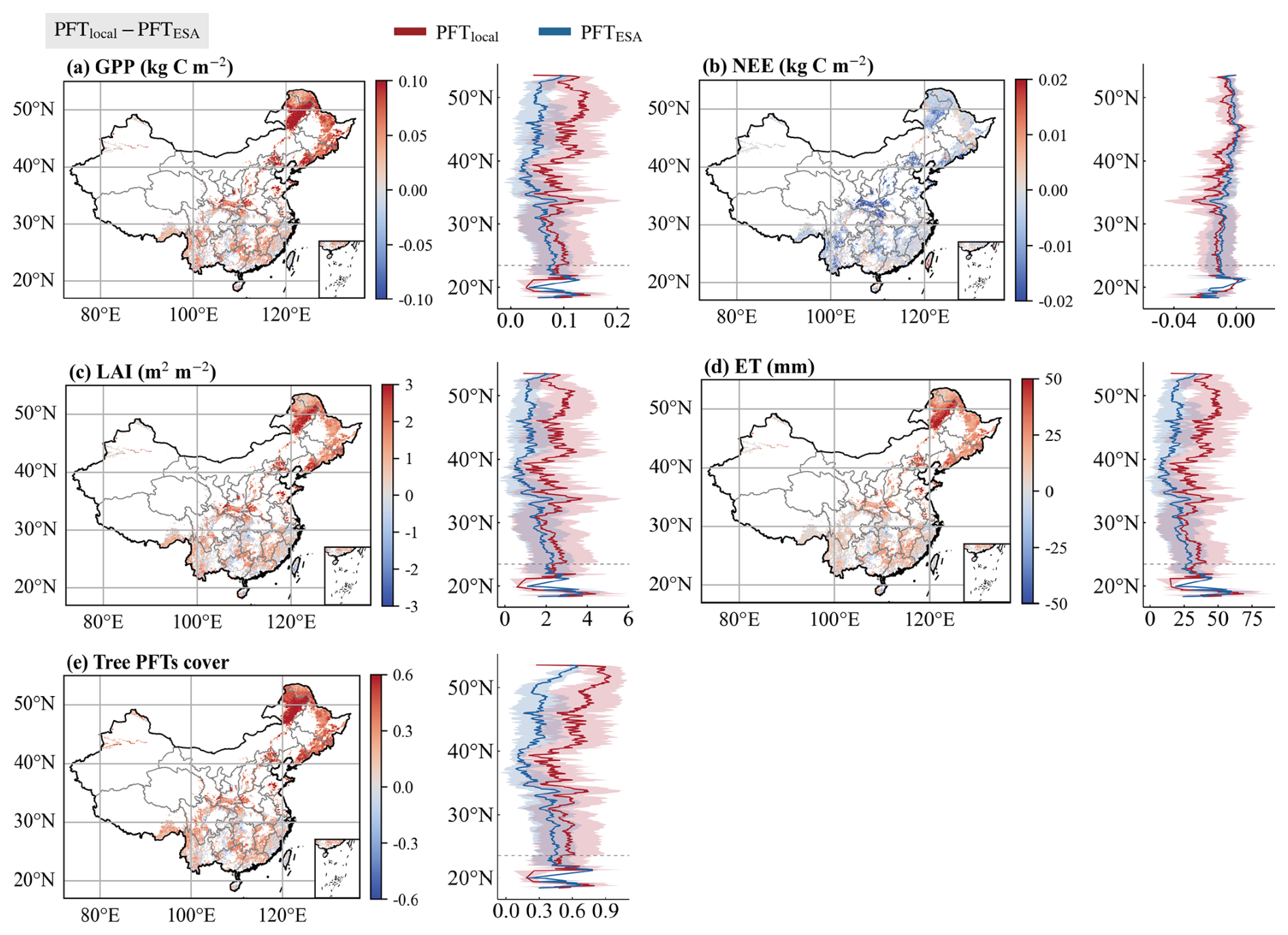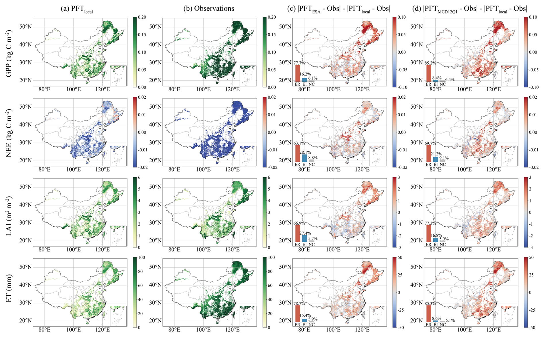 The simulated LAI exhibits a spatial pattern analogous to that of the GPP (Fig. 9a). Relative to PFTESA, PFTlocal reduces errors across 66.9 % of the domain (marked in red in Fig. 9c), with the most pronounced improvements observed in the Northeast China and Qinling regions; conversely, areas of increased error (27.4 %, blue) are primarily situated in southern China. For PFTMCD12Q1, the extent of error reduction expands to 77.3 %, while increased errors (16.8 %) are confined largely to Southwest China and Taiwan (Fig. 9d). The spatial pattern of the simulated ET is consistent with that of the other variables analysed (Fig. 9a). With respect to model improvement (Fig. 9c), PFTlocal reduces simulation errors across 78.7 % of China relative to PFTESA (indicated by extensive red areas), except for certain parts of southern China. Compared with PFTMCD12Q1, this proportion increases to 85.3 % (Fig. 9d). These results indicate that the reconstructed dataset demonstrates distinct superiority over the ESA and MCD12Q1 datasets in simulating major carbon and water fluxes across mainland China.