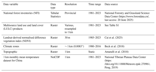 The forest cover and PFTs were derived from the integration of NFI data with multisource remote sensing LULC time series data (Table 1, Table S1 in the Supplement). The LULC data provides the spatial distribution of forest cover across different years. For specific years, land cover classification was used to define the extent of forest PFTs, based on distinctions in phenology and leaf morphology. The NFI data was used to constrain the forest area and structural composition; this ensured that the resulting dataset aligned with reported national trends in forest area dynamics.