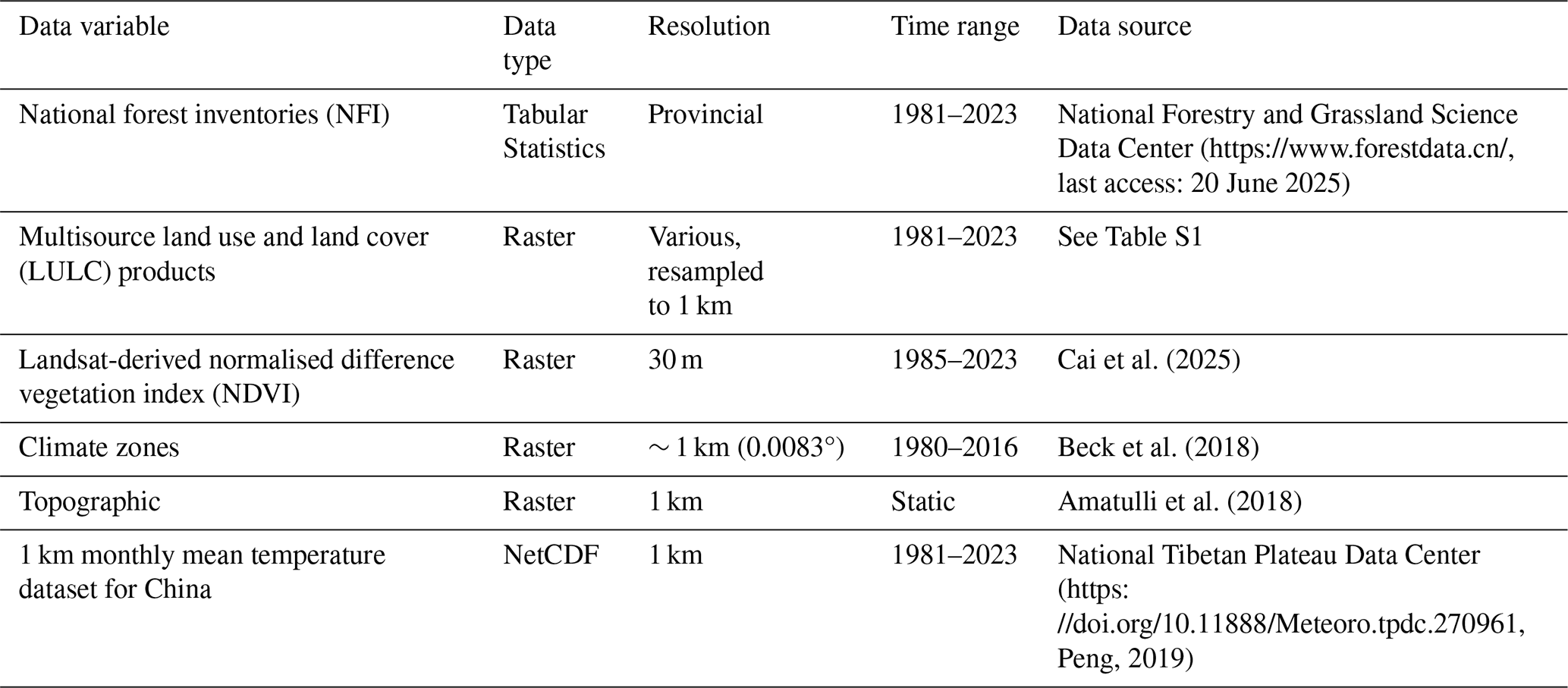 To assign phenological types to the small number of remaining unclassified forestland pixels (see Sect. 3.4.2), two supplementary regional partitioning products were utilised. The first was the Köppen–Geiger climate classification from Beck et al. (2018), which classifies Earth's land surface into 30 distinct climate zones at a 0.0083° resolution (approx. 1 km) on the basis of temperature and precipitation records from 1980–2016. The data are publicly available from Figshare at https://figshare.com/articles/dataset/Present_and_future_K_ppen-Geiger_climate_classification_maps_at_1-km_resolution/6396959/2 (last access: 26 May 2025). The second product was a global topographic dataset from Amatulli et al. (2018), derived from the 250 m GMTED2010 and 90 m SRTM4.1dev digital elevation models. In this dataset, the global land surface is classified into ten topographic categories: flat, peak, ridge, shoulder, spur, slope, hollow, footslope, valley, and pit. The data are publicly available from Earthenv at https://www.earthenv.org/topography (last access: 25 May 2025). In general, needleleaf forests are predominantly evergreen, with the notable exception of larch forests, which are deciduous and found mainly in boreal regions. In contrast, broadleaf forests are typically deciduous, although those in tropical regions are predominantly evergreen. To further classify evergreen and deciduous forest types as either boreal/temperate or tropical (see Sect. 3.4.3), the 1 km resolution monthly mean temperature dataset for China (1981–2023) from Peng et al. (2019a) was utilised. This dataset was generated by spatially downscaling the global 0.5° CRU climate dataset and the high-resolution WorldClim dataset using the delta spatial downscaling method. The data are publicly available from the National Tibetan Plateau Data Center (https://doi.org/10.11888/Meteoro.tpdc.270961, Peng, 2019).