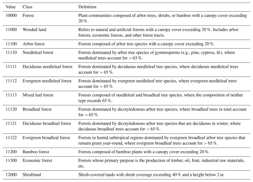 A clear definition of forest composition is needed prior to reconstructing the PFT distribution. In accordance with China's “Technical Regulations for Continuous Forest Inventory” (GB/T 38590–2020), China's forests are divided into categories such as wooded land, arbor forestland, shrubland, bamboo forestland, and economic forestland, following a specific hierarchical classification system (Table 2). The area relationships among these components are defined as follows in Eqs. (1)–(3):