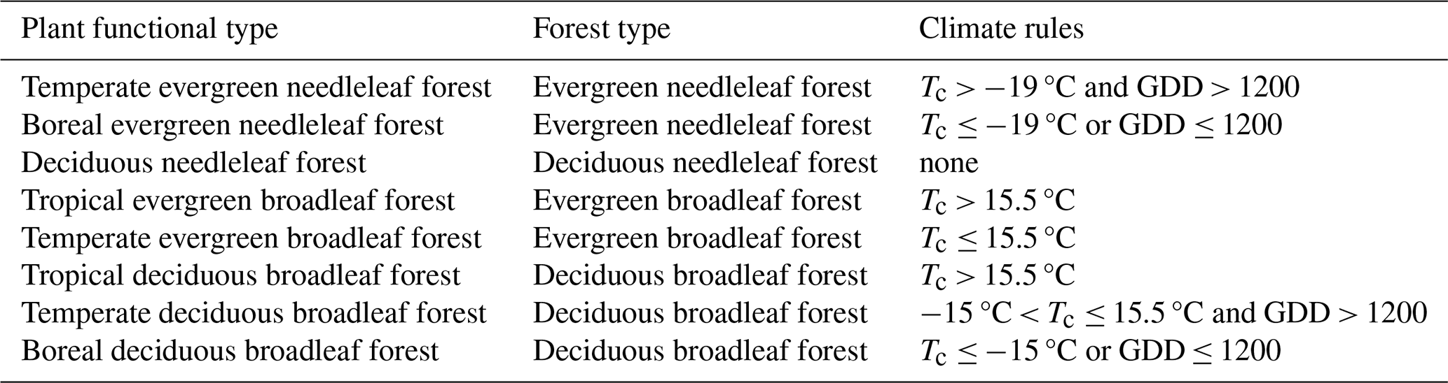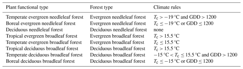 By adopting the methodology of Bonan et al. (2002) and utilising historical climate data (see Sect. 2.4), the five preliminary forest types were further subdivided into nine final PFTs. The specific climatic variables used for this classification are detailed in Table 3 and include the following: