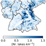 In total, we were able to identify 262 433 small lakes and ponds in Germany, covering 1.2 % of the entire state. 178 194 of those are larger than 1000 m2. They show a characteristic distribution across Germany, with high densities occurring in central and northern Bavaria, as well as Mecklenburg-Western Pomerania and Schleswig-Holstein (Fig. 2). High densities of lakes and ponds in northern Germany are associated with young moraine landscapes while those in northern Bavaria are largely artificial pond landscapes, created since medieval times by localized damming of small rivers for fish farming (Federal Ministry of the Environment, Nature Conservation and Nuclear Safety, 2003). Other prominent areas of high lake and pond densities are the large river valleys of the Elbe and Danube rivers as well as their larger tributaries. These waterbodies are either oxbows formed through natural processes or during river straightening, or excavation lakes that have filled pits created by the mining of riverine deposits (Federal Ministry of the Environment, Nature Conservation and Nuclear Safety, 2003).