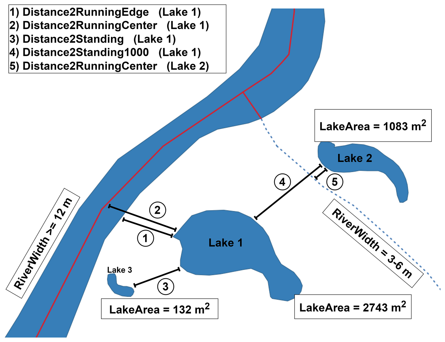 Figure 1Schematic representation of river and stream depiction in the ATKIS Basis-DLM (Digital Landscape Model), along with the derived lake–waterbody distance metrics. The blue dashed line indicates a stream or river with a width less than 12 m, while the blue polygon represents a river wider than 12 m. The red line illustrates the centerline of the wide river polygon, as well as a hypothetical connection to the smaller stream. If the nearest running waterbody to a lake is a river wider than 12 m (see Lake 1), both the Distance2RunningEdge and Distance2RunningCenter metrics are calculated. If the nearest running waterbody is narrower than 12 m, only the Distance2RunningCenter metric is derived. In both cases, the width of the closest river segment is recorded. For standing waterbodies, two separate metrics are calculated: the distance to the nearest standing waterbody (Distance2Standing) and the distance to the nearest standing waterbody larger than 1000 m2. This distinction accounts for the fact that smaller ponds (<1000 m2) may be underrepresented in the digital landscape model.