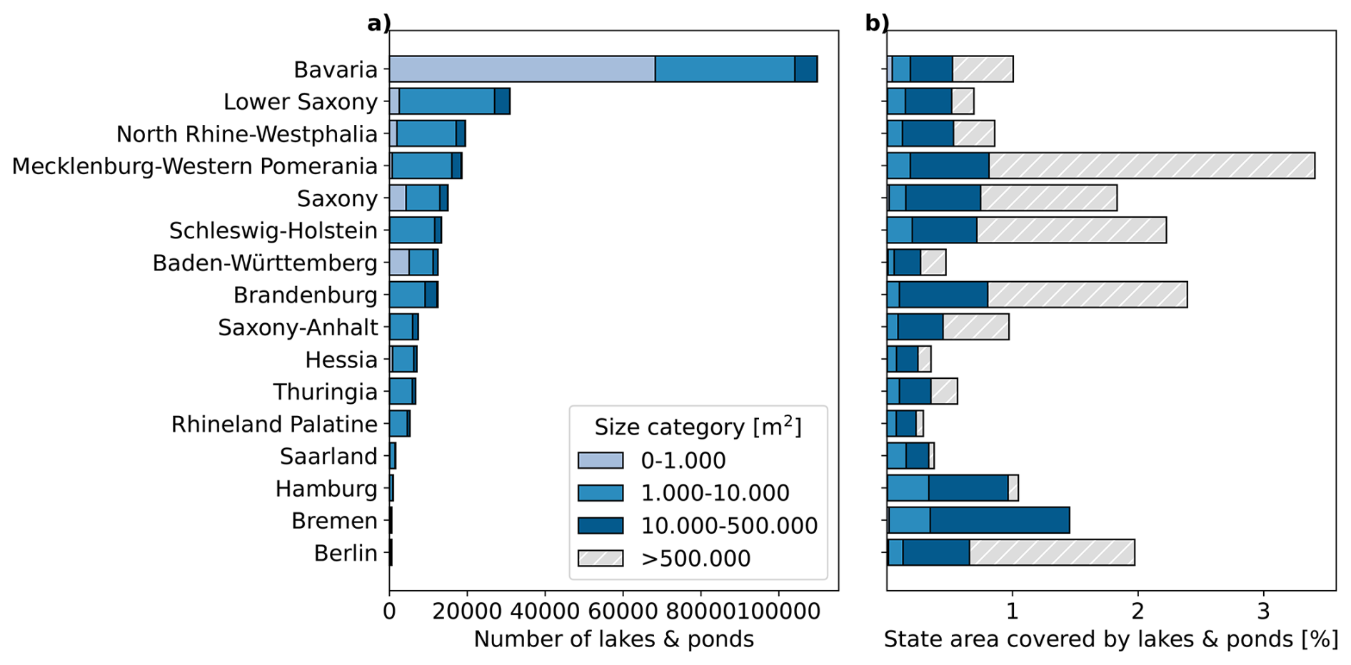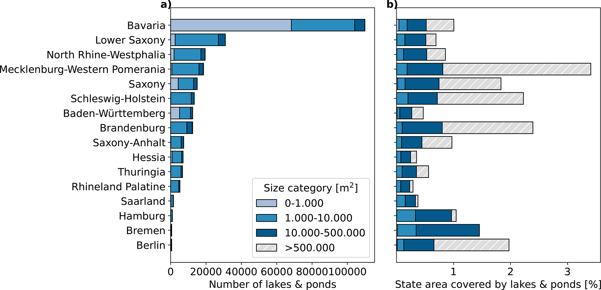 Figure 3(a) Number and (b) share of federal state area covered by of lakes and ponds of different size classes per federal state. Lakes >500 000 m2 fall under the reporting obligation of the water framework directive and are not included in the GSLPI. As lakes of the size category >500 000 m2 are few in numbers, they are not visible in the bar chart of panel (a).