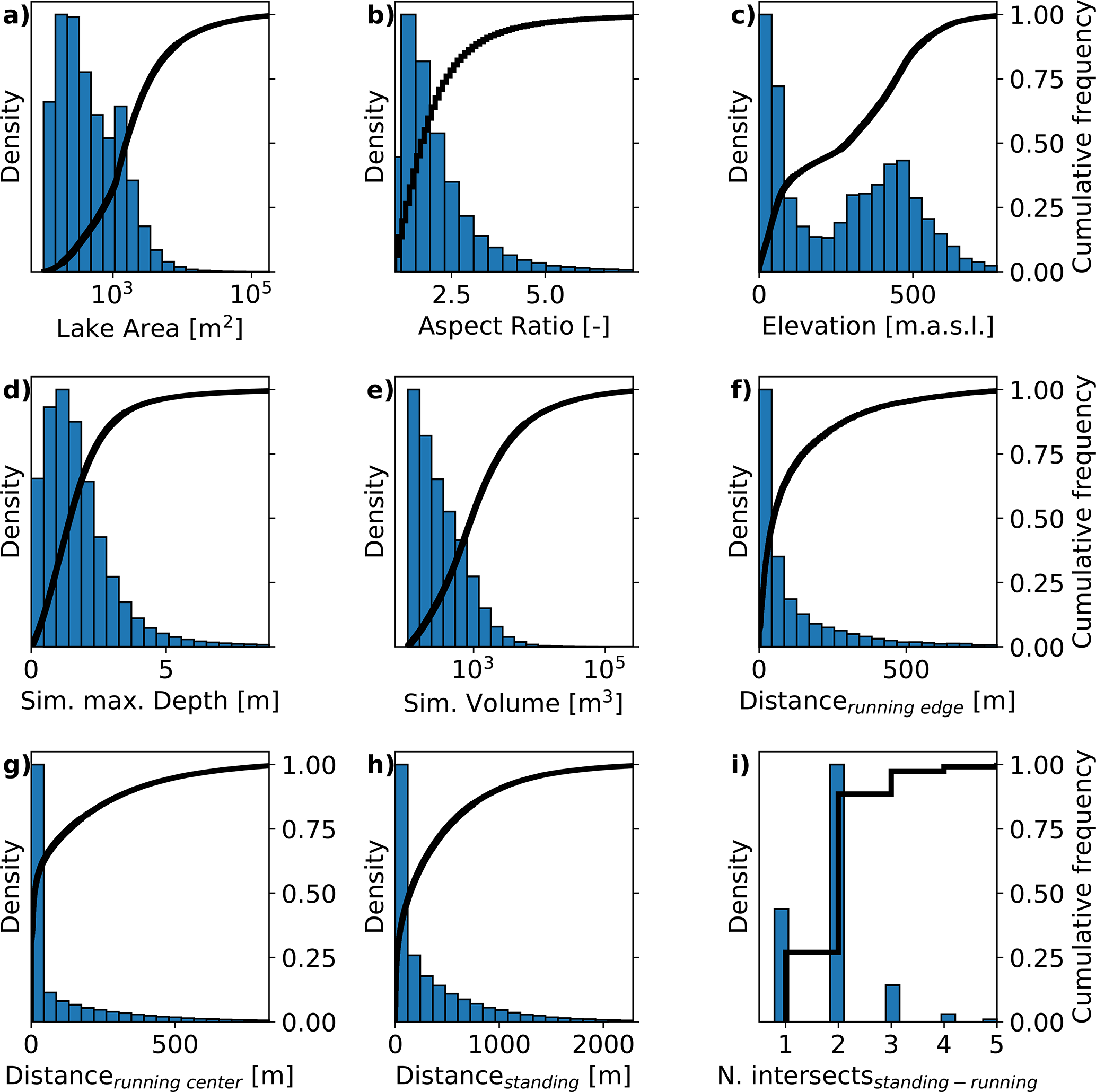 Figure 4Normalized histograms (left y axis) and cumulative frequency distributions (right y axis) for a selection of the derived lake attributes. Each histogram (except panel i) shows the data from the minimum value to the 99th percentile distributed across 20 bins. (a) shows the lake surface area, (b) the lake polygons aspect ratio, (c) its mean elevation above mean sea level, (d) the simulated maximum depth, (e) the simulated volume, (f) the distance to the edge of the closest running waterbody, (g) the distance to the center of the closest running waterbody, (h) the distance to the closest standing waterbody, and (i) the number of intersections between the lake and the river network.
