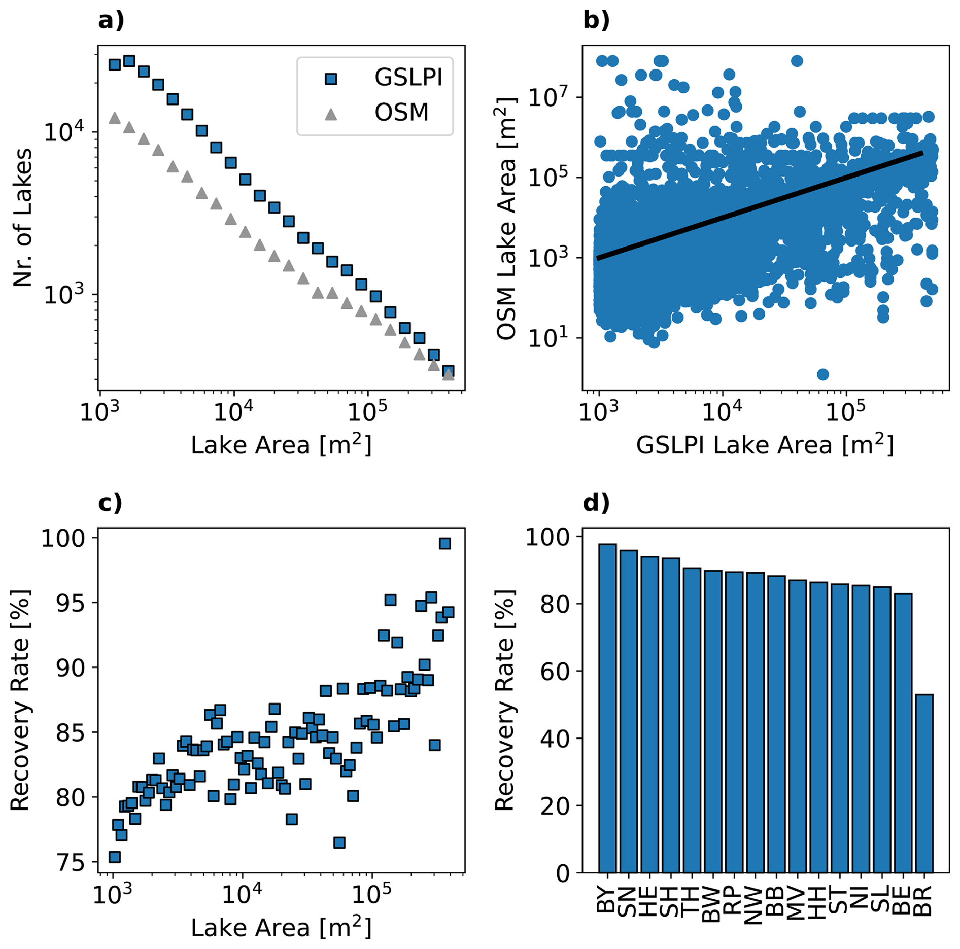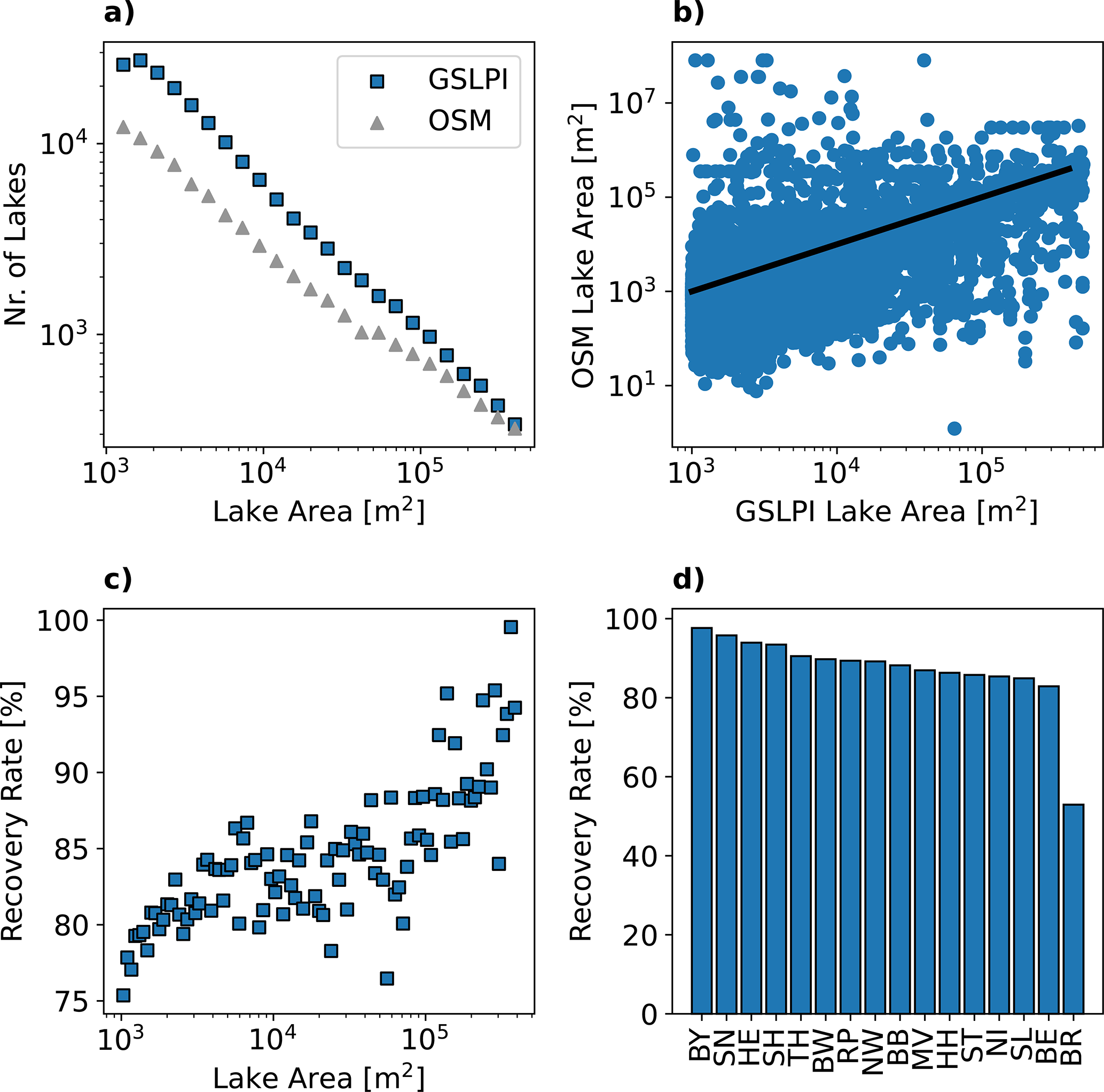 Figure 5Results of the comparison between the German small lake and pond inventory (GSLPI) and the standing water bodies retrieved from OpenStreetMap (OSM). (a) shows the log-log size abundance plot for both data sets. In (b) lake surface areas from both data sets are compared. The black line indicates perfect match. The recovery rate (c, d) is the share of lakes from OSM which also exist in the GSLPI shown as a function of lake area (c) and federal state (d).